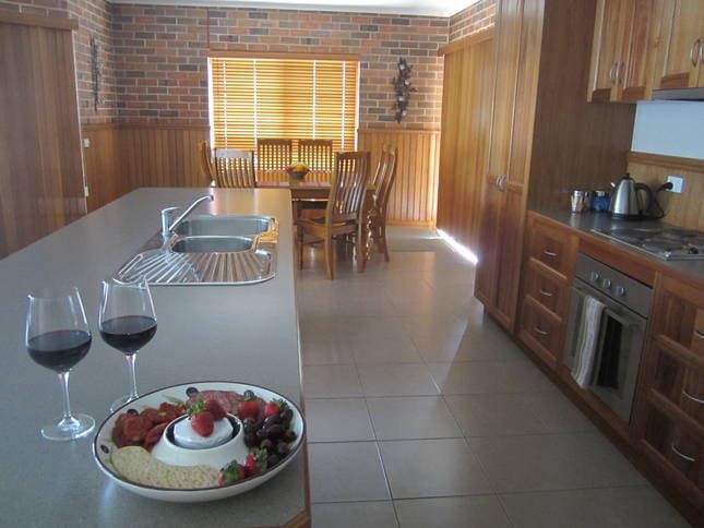 1 split system heating and air conditioning in the main living area Large kitchen with dishwasher, microwave pots pans etc. Fully kitted out for all your needs. 2 showers 2 toilets to accommodate larger groups. All linen and towels are new with spare towels for use at the stunning local pool or lake. Community hotel is a 2-minute walk along with IGA and all or lovely local shops. The rear yard is immaculate with a large selection of fruit trees for you to help yourself too.