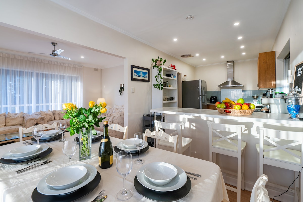 Uživajte in se sprostite v naši sodobni in elegantni hiši za goste. Nahaja se v zalivu Hallett Cove in stopinje od slikovitih vrhunskih razgledov na ocean in zloglasne Marino Esplanade do Hallett Cove, rezervira obalno sprehajališče z na novo zgrajenimi visečimi mostovi ob namestitvi. 15 minut vožnje z avtomobilom ali vlakom do bolnišnice in univerze Flinders ter manj kot pol ure do slavnih vinskih kleti McLaren Vale in Adelaide CBD je to odlična lokacija za vaše bivanje, naj bo to za delo ali prosti čas.