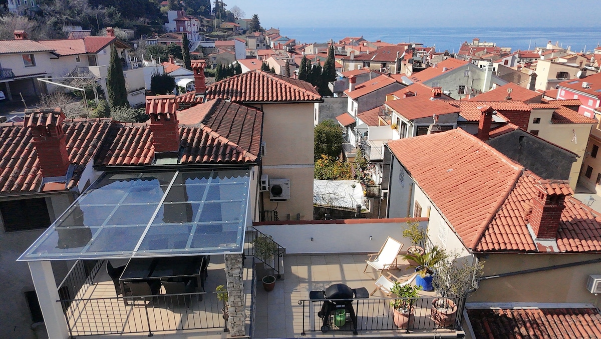 Attic apartment with its own entrance, large balcony & hidden terrace: a unique view over the Adriatic sea. Children & pets friendly, located just 10 min walk from Piran' s city centre, but up on a hill. Very quiet area to relax and enjoy. Private parking place in shade in front of the house, which is rare for Piran' s area. The view is breath-taking! Quite and green neighbourhood. Perfect stay for families.