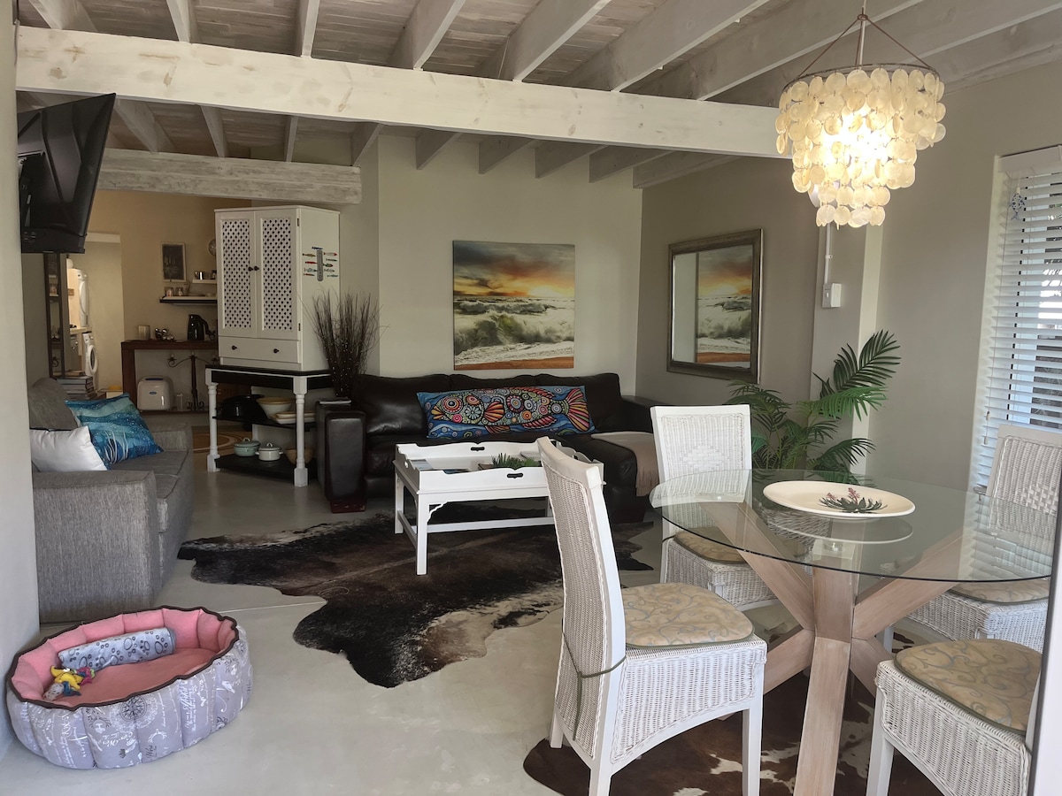 Samostojno prenočišče z dvema spalnicama Stanovanje se nahaja na koncu slepe ulice, le 15 metrov od rečnega ustja Swart vlei. 2 enojni postelji/pripravljeni kot velika zakonska postelja z lastno kopalnico. Raztegljiv kavč v dnevni sobi. 2. spalnica z 2 enojnima posteljama, ki ju lahko na zahtevo raztegnemo v zakonsko posteljo. Stanovanje ima lasten vhod in parkirišče. Na voljo je dodatno parkirišče. Gostom sta na voljo dva kajaka in kanuja ter 2x stoječe deske. Ptičje življenje je bogato. Veselimo se, da bomo naš raj delili z vami. Kmalu se vidimo.