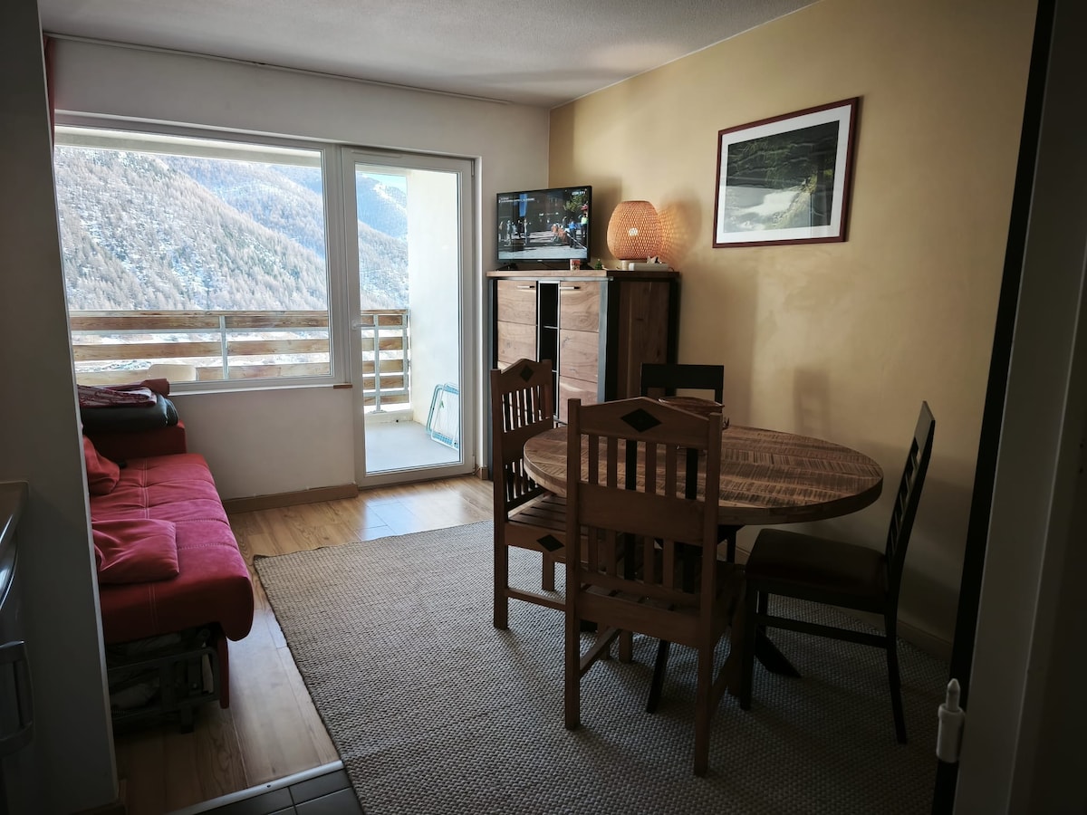 Ce logement pour 4 personnes est équipé du nécessaire pour passer un agréable séjour à la montagne été comme hiver. Couchage : Canapé convertible 160x200 + 2 lits superposés 90x190 (oreillers et couettes fournis, prévoir draps) Salle de bain avec baignoire (prévoir serviettes de bain), Kitchenette équipée (frigo, micro onde, 2 plaques, 1 appareil multi usage raclette fondue, cafetière classique + Tassimo...). 1 balcon avec vue sur les pistes et les marmottes. wifi par fibre inclus.