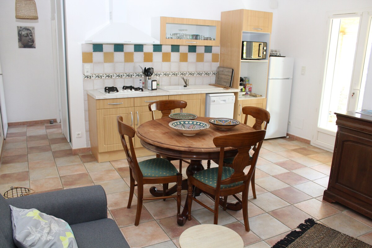 ECRIN DE VERDURE Logt 60 M2 ( dnevna soba , kuhinja, 2 KM, 1 kopalnica + 1 stranišče)se nahaja v pritličju hiše z zasebno teraso. Parcela 28OO M2 in bazen sta skupna lastnikom. Nahaja se 2 koraka od Montpellierja ( 15 minut) in morja v srednjeveški vasi. Vsa oprema za trgovine in javni prevoz. Posojilo brezplačnega kolesarjenja. Pohodi na kraju samem. Dostop do fitnes opreme + trampolin + miza pod borovci......Log idealen za družino.