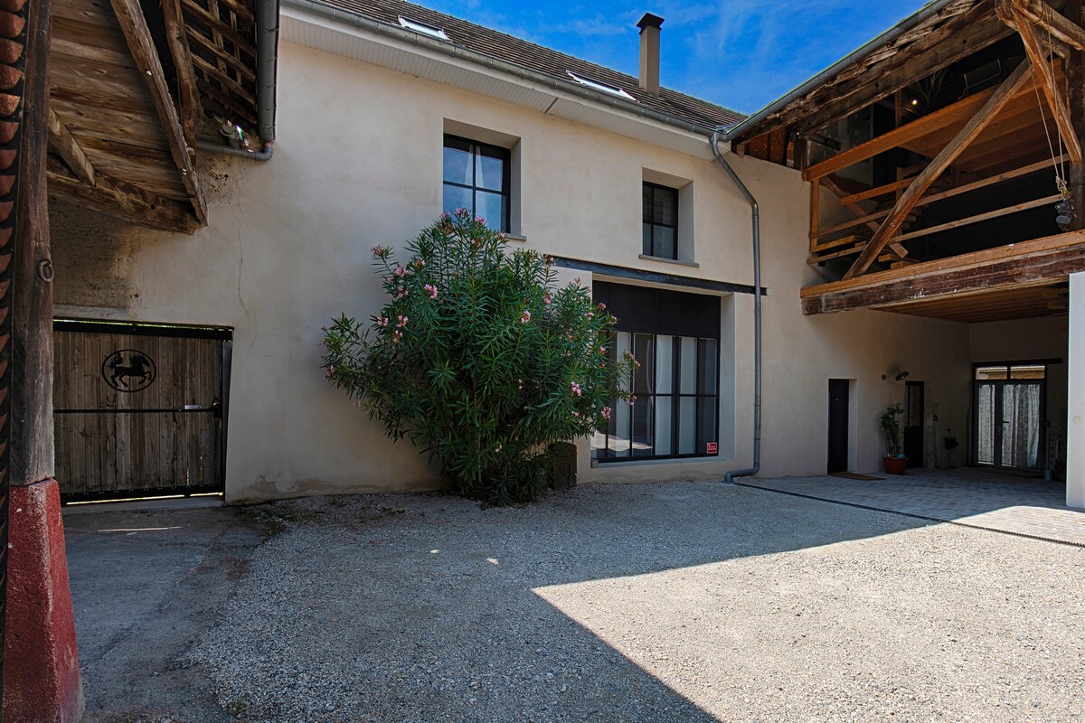 Découvrez un duplex idéalement placé sur les bords du Rhône, au coeur d'un moulin du XV° siècle. Vous y trouverez un gïte récent, propre, confortable, bien équipé et pourvu d'espaces lumineux Entre Lyon, Bourg-en-Bresse, Geneve et Annecy; proche de la PIPA, de la CNPE, de la Via Rhôna; ce duplex s'adresse aux couples, familles ou aux professionnels qui apprécient la proximité et le calme. Le plus ? Un balcon logia équipé d'un bain nordique privé offrant une vue sur les montagnes du Bugey