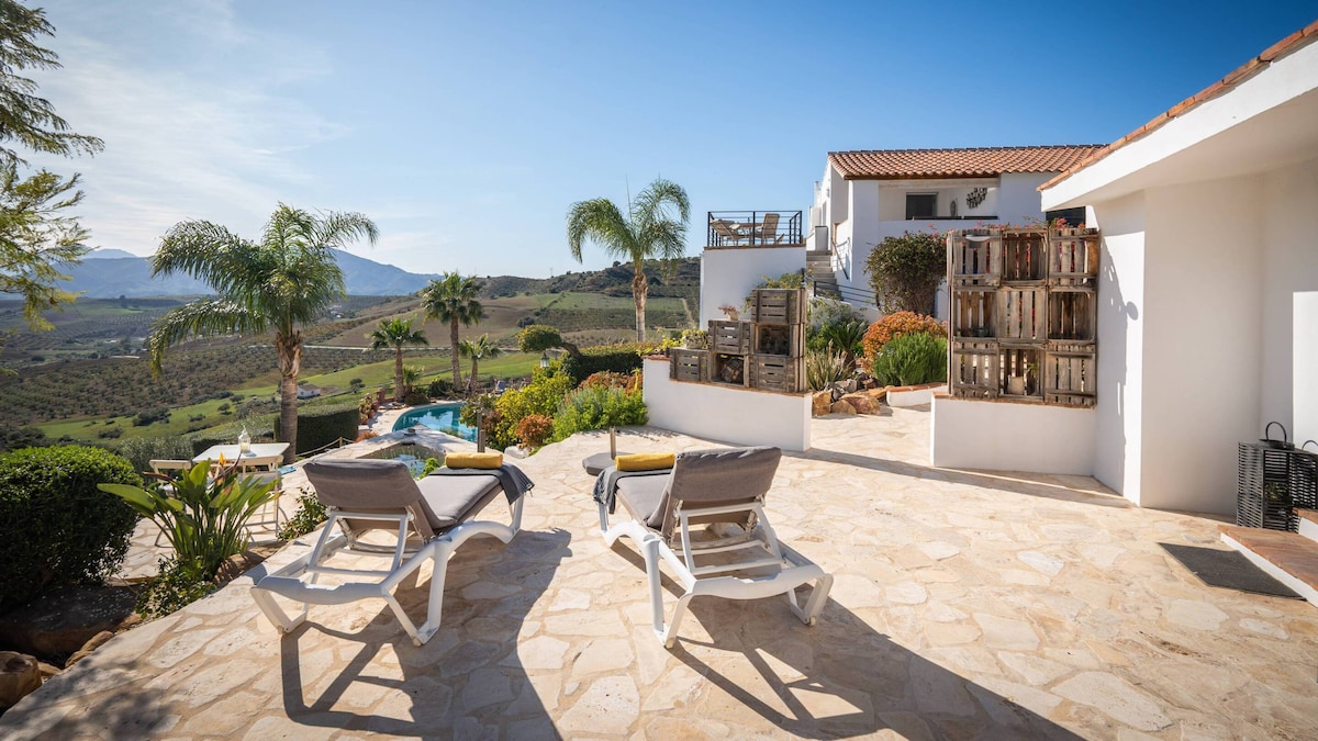 A peaceful country get-away with luxury amenities. Nestled in the Andalusian mountains and only 20 min to the sea & coastal towns. Child friendly. The jacuzzi & indoor pool are heated year round and for your use. They are in private areas of the property. There is an outdoor kitchen with gas BBQ, bluetooth speaker, and dining space near the pool. The casa has a covered terrace with views of the avocado orchard. The gardens are lush with tropical plants, colorful blooms & sprawling lawns.