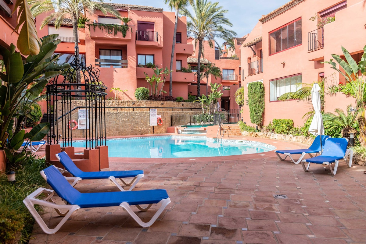 Gorgeous apartment located in the luxury Nueva Andalucia - Puerto Banus Area, just a 30ish minutes walk away from the beach and the port. Though very close to the vibrant life of Puerto Banus, also known as the Spanish St Tropez, the apartment is located in a quiet, private residential area, so you'll be able to enjoy the warm, sunny weather and Marbella's beaches and just simply relax. The apartment comes with a common swimming pool and garden, and a private terrace.