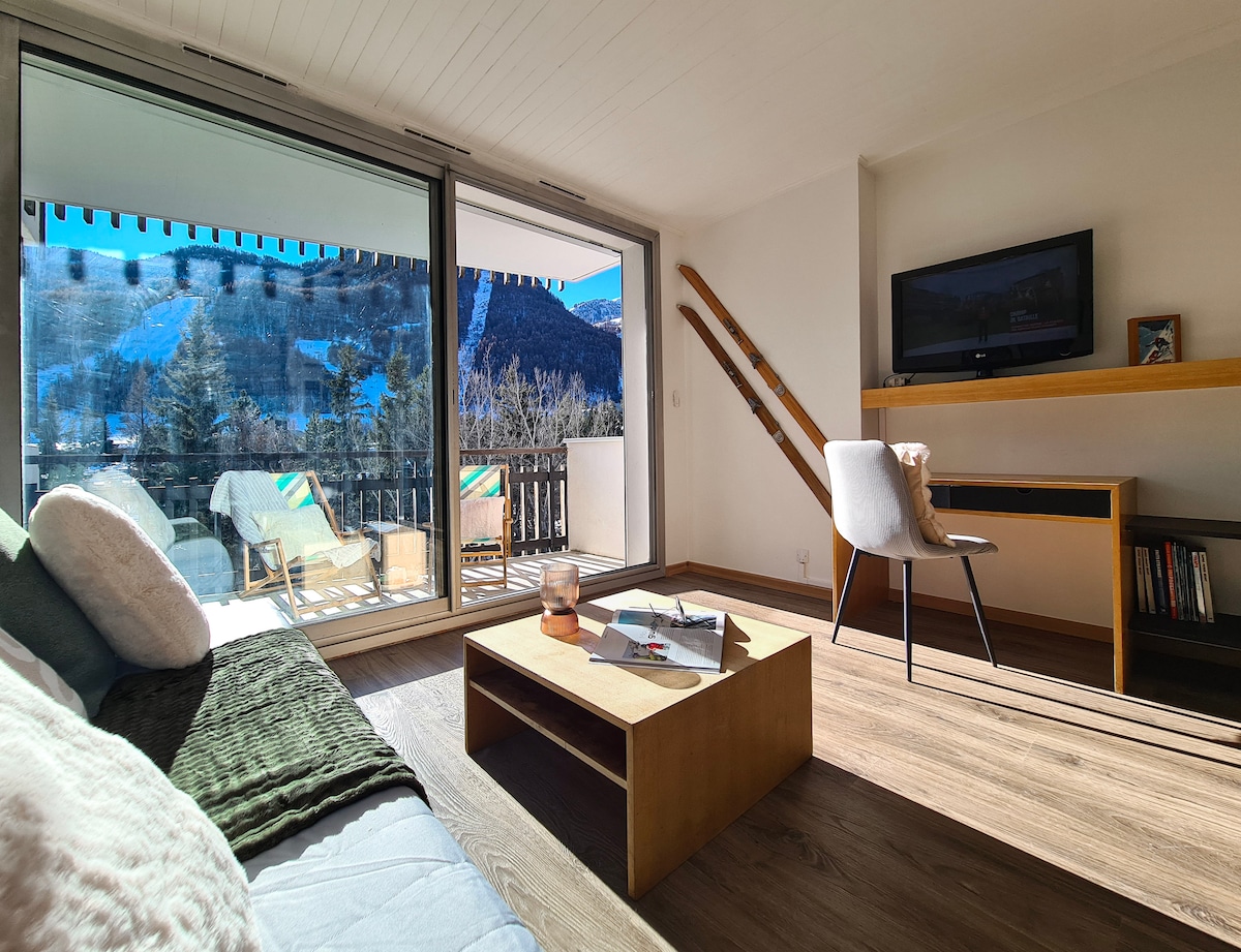 Ob vznožju pobočja očarljivo gorsko stanovanje velikosti 40 m2 (za 4 osebe), vključno z glavno sobo s čudovitim razgledom na pobočja, popolnoma opremljeno kuhinjo, kopalnico s kadjo, pralnim strojem, popolnoma opremljeno kuhinjo (indukcija, pomivalni stroj, zamrzovalnik...) gorski kotiček z dvema posteljama , balkonom, neodvisnim straniščem, smučarsko sobo, zasebnim parkiriščem... Vse trgovine in restavracije v bližini. Tedenski najem ali mi