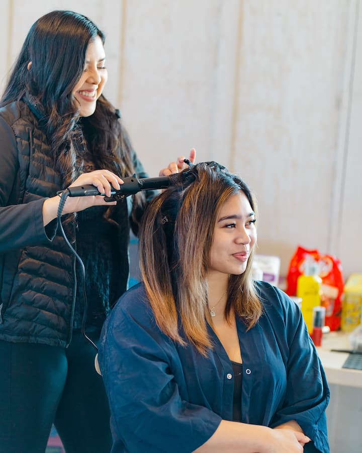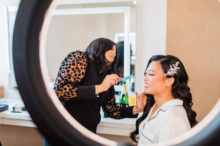 Ta paket vključuje kodranje ali oblikovanje las za polovično spete in polovično spuščene lase. Če ste nevesta, rezervirajte poročni termin.
