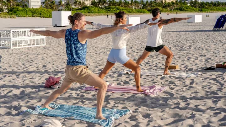Pridružite se našemu tečaju raztezanja na plaži Muscle Beach v Miamiju.