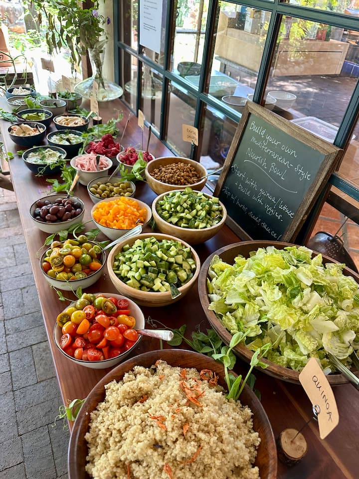 Vključno z izborom rastlinskih ali živalskih beljakovin, sveže pripravljeno ekološko zelenjavo, žitaricami, domačimi omakami in prelivi ter prilogami.