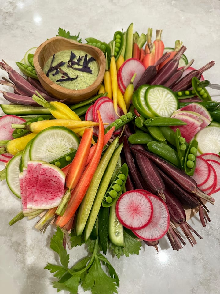 Sezonska kmečka košara, polna lokalnega sadja, zelenjave, cvetja, kalifornijskih oljk in še marsikaj drugega (končni strošek je določen glede na število gostov, ki jim je košara namenjena)