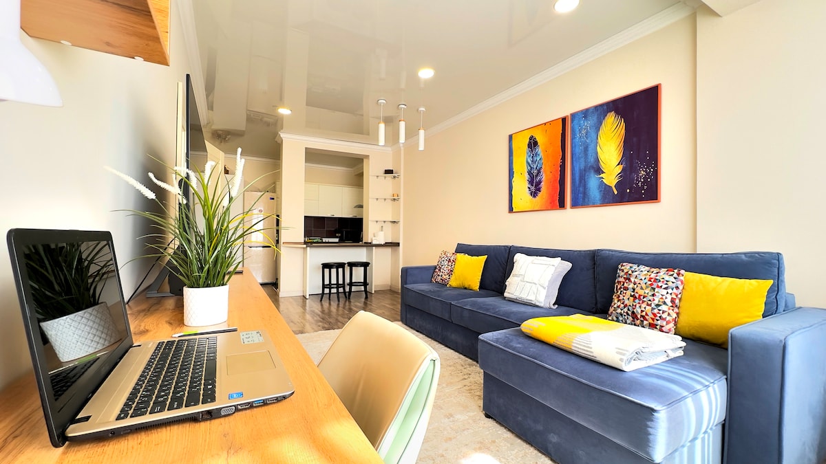 A stylish modern flat is a great option for leisure and business trips. Located in the center of Almaty, 100 m from Abaya Street. Nearby are the circus, the Sports Palace, the Republic Palace, the central stadium, the cable car, Lermontov Theater, Mukhtar Auezov Theater. The studio is fully equipped for 2 people: a sofa, a double bed, a kitchen area with necessary appliances, a bathroom, a large TV and high-speed WiFi. Windows with mountain views and a quiet courtyard.