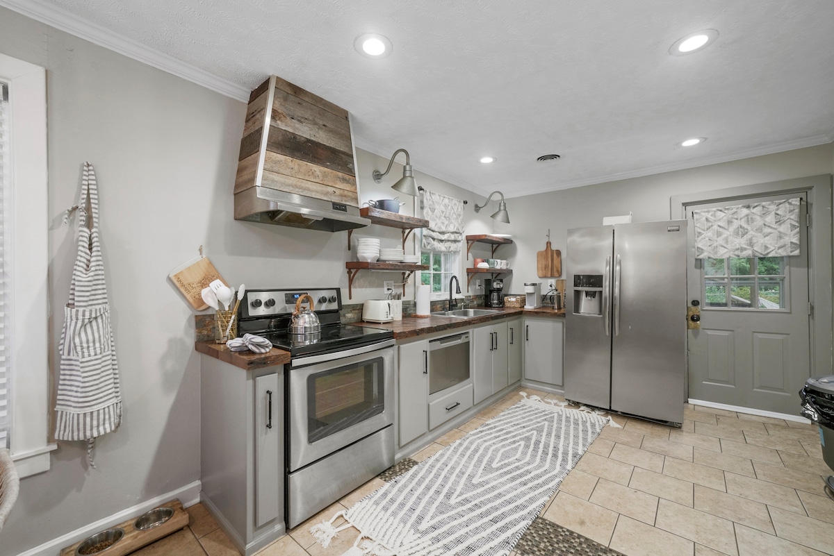 Dobrodošli v The Heights! Za začetnike vas bodo pozdravili s svežo ponev Talbot Cinnamon Rolls.* Za bivanja, ki trajajo tri noči ali več, boste v hladilniku našli tudi sir, meso in razpoko. Kuhinja je opremljena z aparatom za kavo Keurig (drip in K-Cup) s kavo. Hladilnik je opremljen z vodo, sokom in penečo vodo. To prenočišče iz 70. let je bilo brezhibno urejeno in nudi udobje treh spalnic, dveh kopalnic, dnevne sobe in kompletne kuhinje.