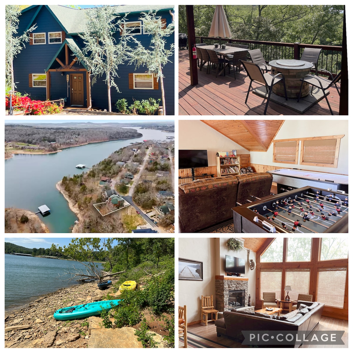Zaradi spremembe lastnika prosimo, da vsa prihodnja bivanja – z začetkom v avgustu – rezervirate v naslednjem prenočišču: airbnb.com/h/treehouse-with-lake-view-n Pridite uživati v tej hiški ob jezeru, ki ima 3 spalnice, 2 kopalnici, 2 prostorni dnevni sobi s pametnimi televizorji in satelitsko televizijo. Kamin na drva v 1. nadstropju, knjižnica in družabne igre v 2. nadstropju. Sprostite se in uživajte v topli ali hladni pijači na strešni terasi s panoramskim razgledom na jezero Table Rock in lepoto gorovja Ozark.