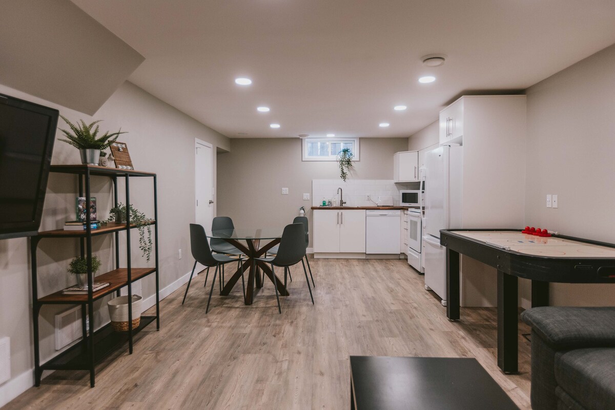 Dobrodošli v svojem zasebnem prenočišču, daleč od doma, prostorno, udobno in popolnoma opremljeno za bivanje v Edmontonu. ✓ Ni dolgega seznama opravil ob odhodu - mi čistimo. Zasebna suita z ✓ 2 spalnicama ✓ Ločen vhod ✓ Kuhinja, kopalnica, bivališče/jedilnica ✓ Brezplačna pralnica v spalnici Miza ✓ za zračni hokej ✓ 15 minut do središča mesta ✓ 5 minut do Sherwood Parka ✓ Enostaven dostop do Yellowheada in Hendaya ✓ 10 minut do stadiona Commonwealtha ✓ 1 ulica do doline reke in parka Rundle ✓ Zvočno izolirano ✓ Hiter Wi-Fi ✓ Dodatne odeje in brisače