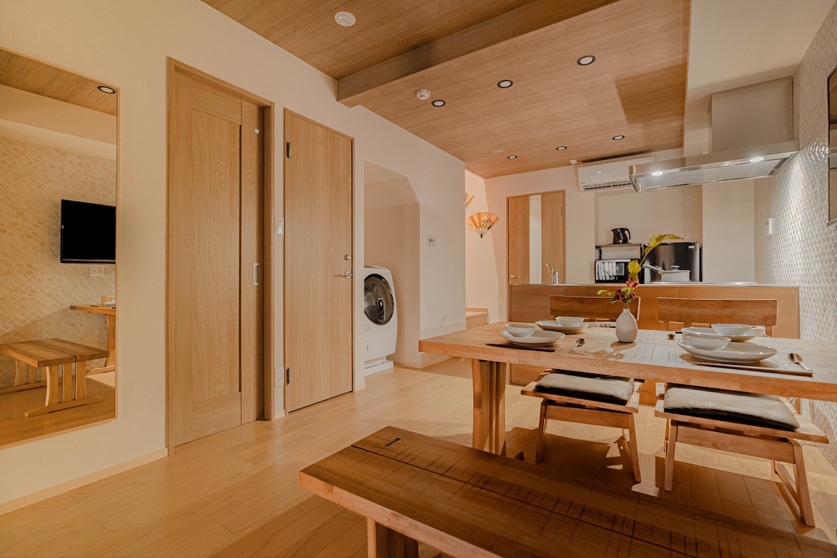 Located about 10 minutes by taxi from Kyoto Station, It is conveniently within walking distance from the bustling Shijo Street.The scenic neighborhood is home to intriguing machiya-style homes. A fully-renovated Kyomachiya nearly 100 years old, guests will enjoy the unique Kyomachiya exterior and refined modern Japanese interior. The living room offers a full view of the inner garden, perfect for dining and entertainment. Guests can enjoy a calming bath with views of the inner garden.