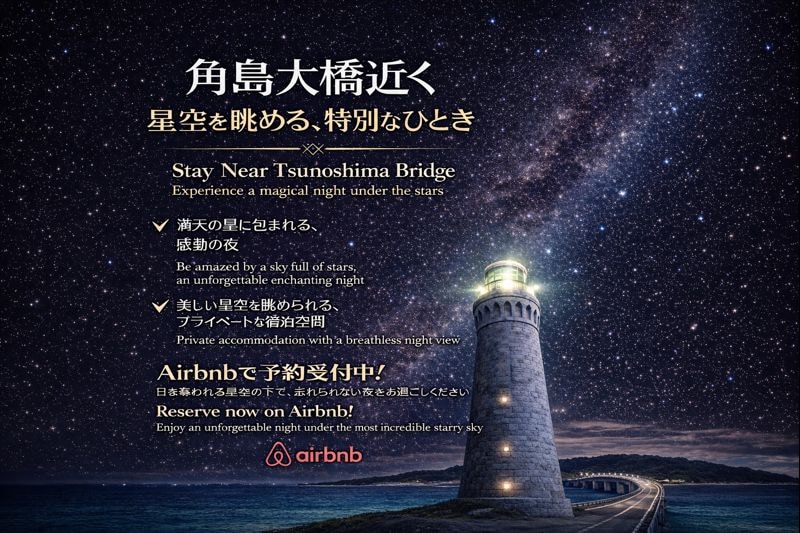 Nahaja se v bližini jantarnega oceana in mostu Tsunoshima. Stavba se nahaja v sožitju z naravo. Enostaven dostop do kraja Shimonoseki/Fukuoka/Hagi. Edinstveno prenočišče za opazovanje zvezd. Reaaxing retreat. Hiša z brezplačnim parkiranjem. Mirno obmorsko prenočišče z morskim vetričem. sprejemamo do 1 in 3 osebe. Dostop ✈ 1 uro in 20 minut od letališča Ube. ✈ 1 uro in 30 minut od letališča New Kitakyushu. 🚗1 uro od postaje Shimonoseki IC. 🚗1 uro od Mine IC. 🚊&🚗8 minut s taksijem od postaje Agawa.