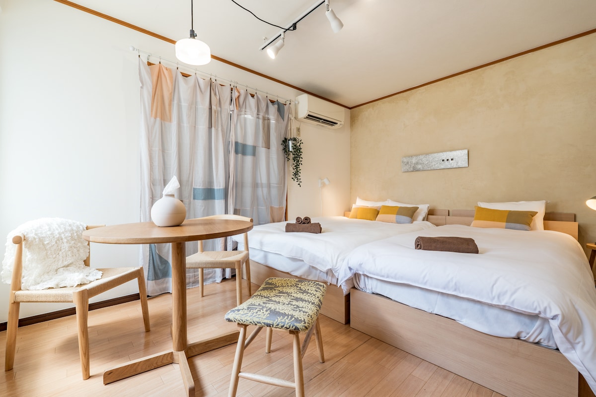 We manage studio apartment. The room is located in the Shin-Okubo area. That space is a studio apartment,but enough to rest and sleep for 2 people. One bed in that space is single size. If you want to stay with two people, we will prepare a Japanese-style futon. We also have one room available for you near Haneda Airport. That room is convenient for taking planes and bullet trains. Please feel free to contact us.