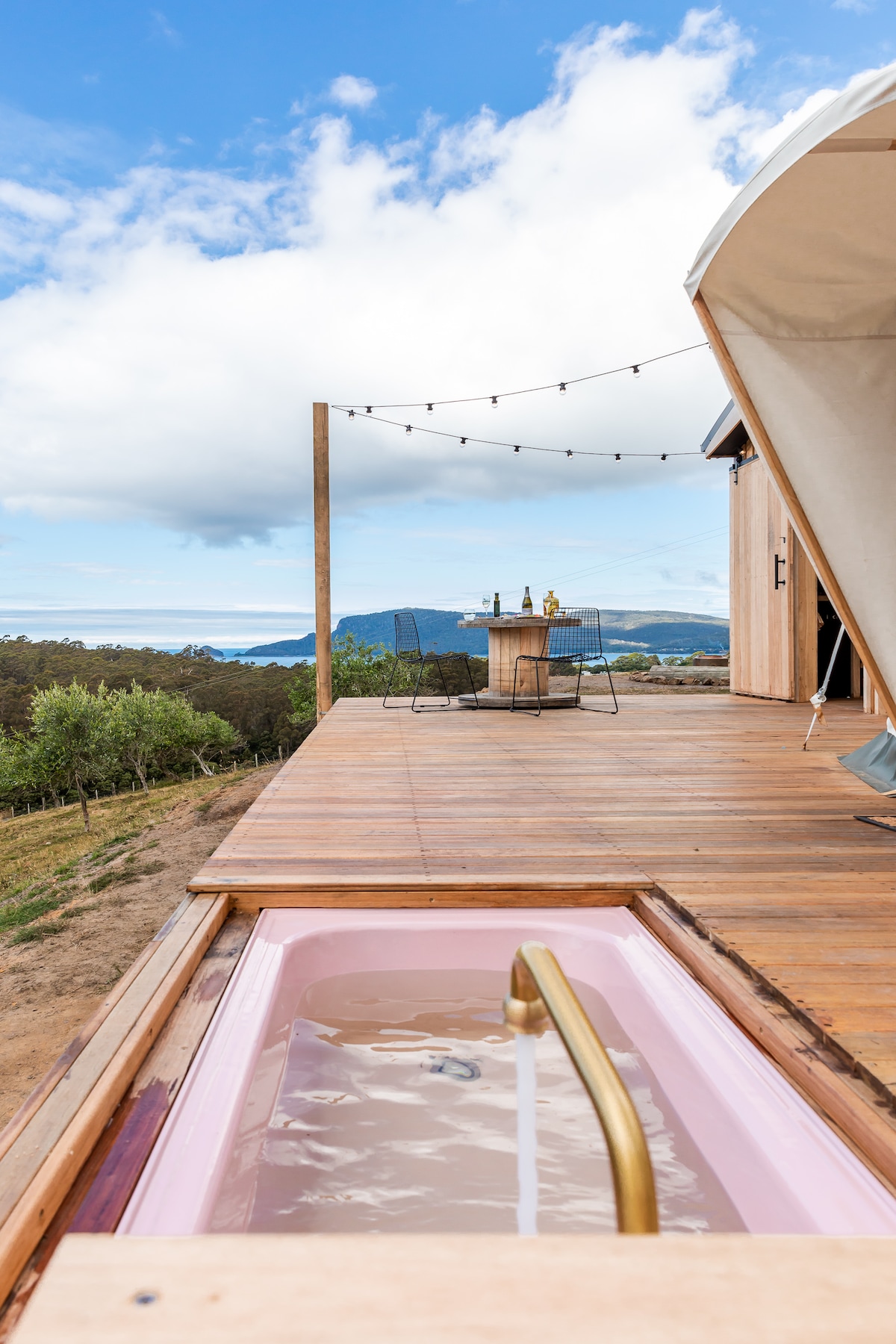 Nestled in an olive grove with views over Bruny Island’s famous Fluted Cape, our yurts offer the ultimate romantic glamping experience, with private bathroom and cooking facilities and an outdoor bath and fire pit for star gazing. Each yurt is furnished with vintage wares collected from all over the world, an internal wood fire, timber floors, and wool lined walls for cosy nights. Double glazed windows look out over the grove and surrounding forest which wraps 360 degrees around our farm.