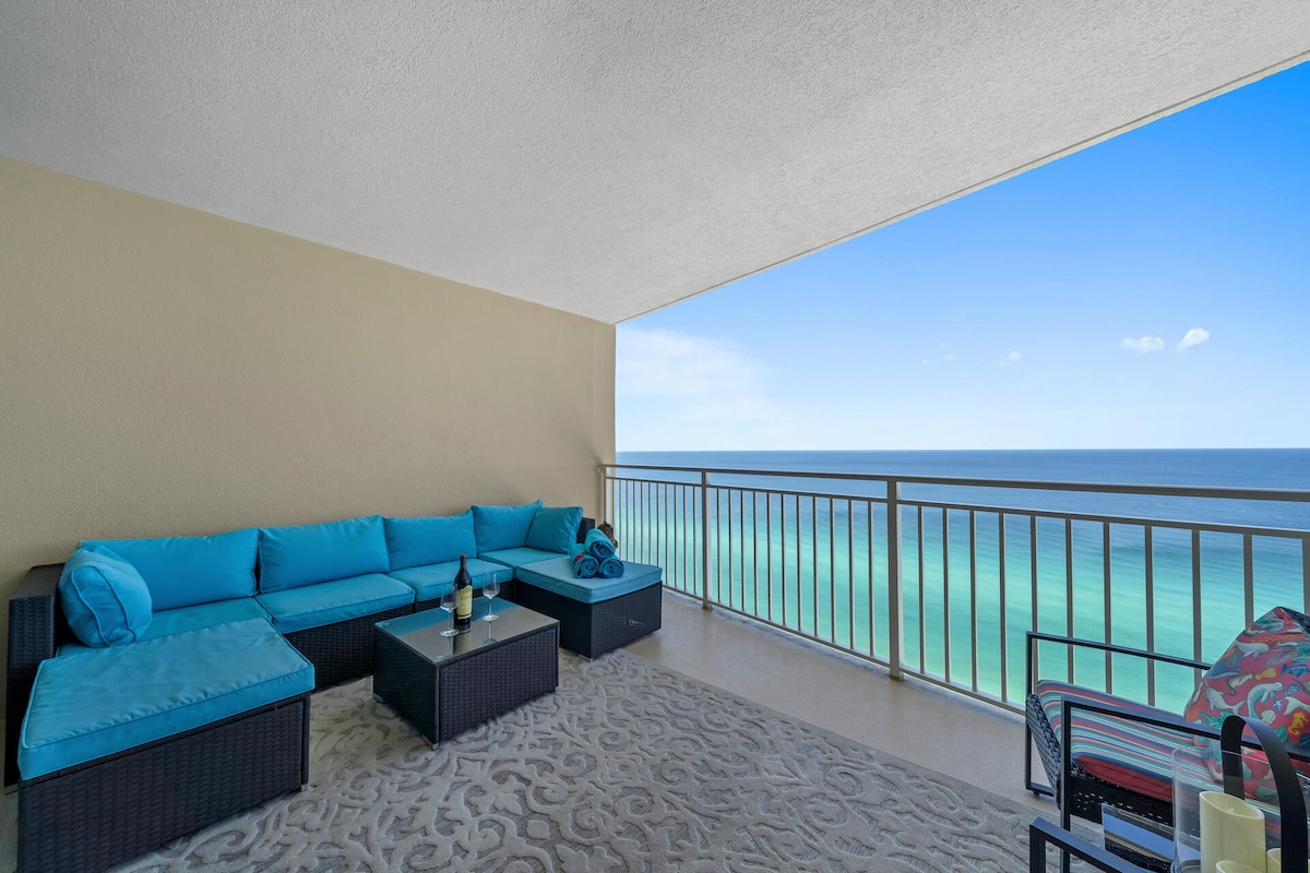 Updated and Gorgeous Views! 21st-floor sub-penthouse with PRIMARY BEDROOM ON THE GULF. Rare 1BR right on the beach, freshly updated in 2025: NEW king bed, 75" TV, appliances, couch & LG washer/dryer. Walk to Pier Park, Topgolf & Margaritaville. Enjoy 2 heated pools, tiki bar, fire pits & sugar-white sand. Perfect spring break escape for couples—warm sun, stunning sunsets & beach days! 🌴☀️