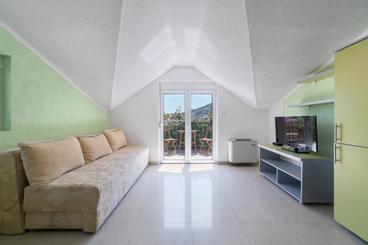 To elegantno stanovanje v drugem nadstropju se razprostira na več kot 45 kvadratnih metrih in združuje udobje in slog. Vključuje udobno spalnico, kopalnico s kadjo, prho in bidejem ter prostorno teraso s pogledom na zaliv Kruče z veliko jedilno mizo, ki je kot nalašč za uživanje v razgledu ob osvežujočem kozarcu vina. Elegantna notranjost prikazuje naravni kamen in parket ter vključuje sodobno opremo, kot so TV z ravnim zaslonom, mini sef in minibar.