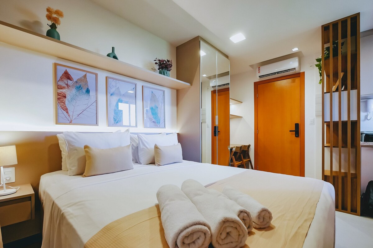 Studio na poti dreves s tehnologijo in udobjem. Blizu nakupovalnega središča Shopping da Bahia, podzemne in avtobusne postaje, poleg Av. Tancredo Neves – poslovno središče Salvadorja. Idealno za največ 3 goste, z zakonsko posteljo in dodatnim ležiščem, klimatsko napravo, pametno 42-palčno televizijo z naročnino na Netflix, hitrim Wi-Fi-jem in sistemom Alexa za glasovno upravljanje luči, televizije in klimatske naprave. Opremljena kuhinja in polno perilo. Stavba ponuja bazen na strehi, telovadnico, skupno delo, pralnico, mini-tržnico in 24-urnega receptorja.