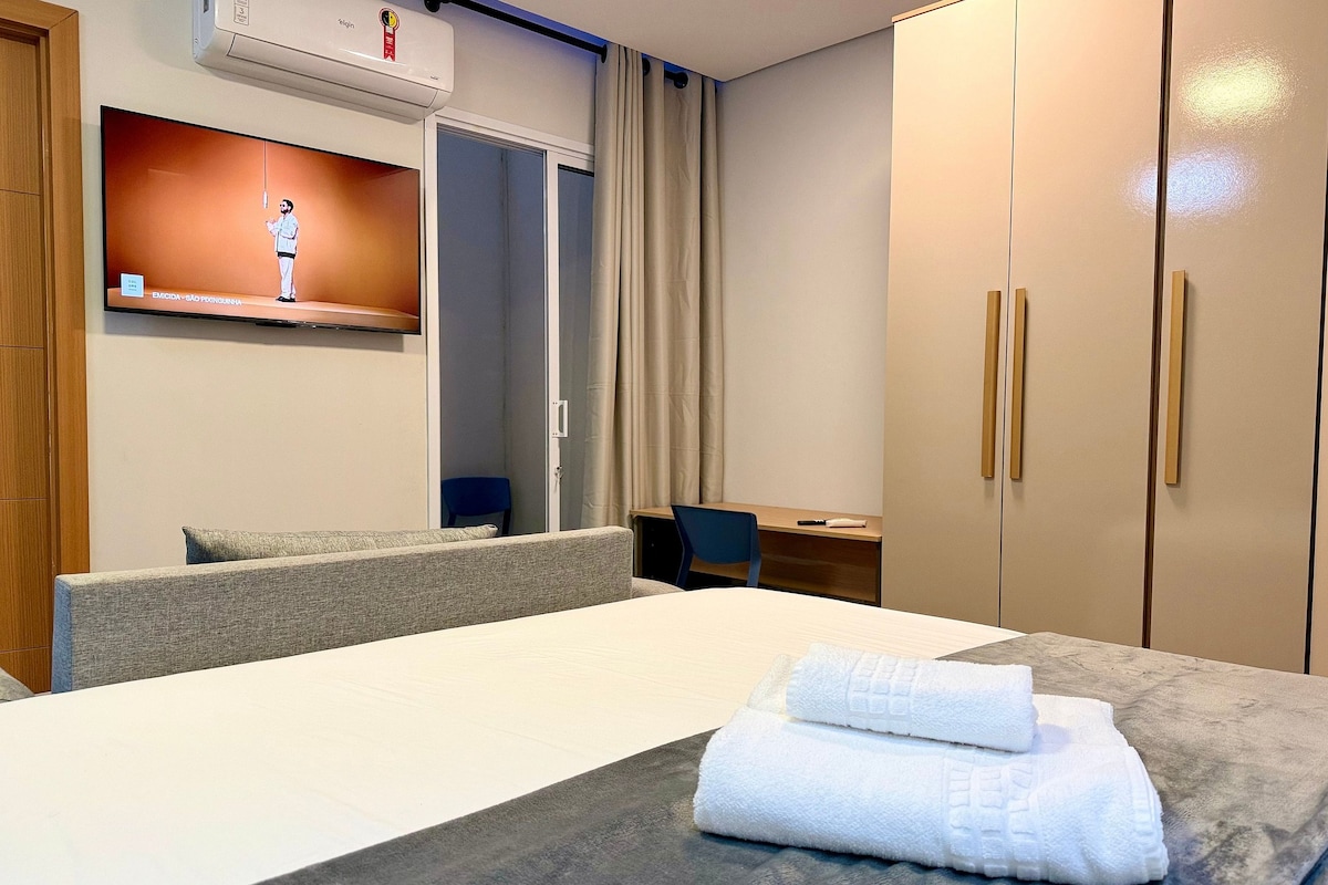Sodobna in udobna garsonjera s površino24m2, manj kot 5 minut od podzemne železnice in nakupovalnega bulvarja Tatuapé. Opremljeno s klimatsko napravo, Wi-Fi-jem, kuhinjsko nišo (cvrtnik, mikrovalovna pečica, hladilnik, električni grelnik vode), vključena oprema (milo, šampon, sušilnik za lase), posteljnina in brisače. Stanovanje s pralnico, skupnim delom, telovadnico, bazenom in gurmanskim prostorom. Stavba z non stop varnostjo Idealno za prosti čas ali delo.