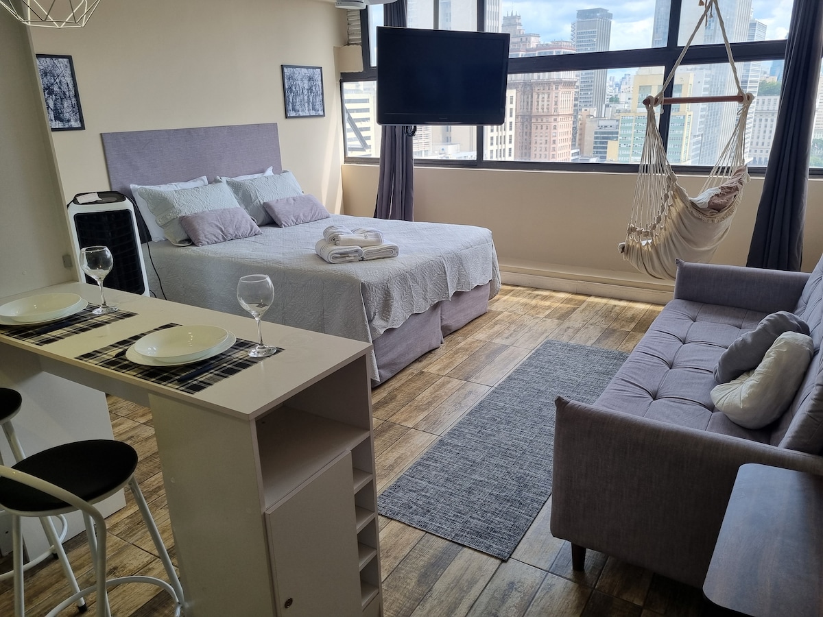 Hospede-se no 30º andar do edifício mais alto do centro de São Paulo, MIRANTE DO VALE e aproveite o agito da região. Studio novo, todo equipado, aconchegante e confortável . Dê uma olhada nas fotos, você vai se surpreender com a vista maravilhosa e com o charme da decoração. Pertinho da 25 de março, do Mercadão, da Casa do Porco, Farol Santander, Bar Brahma e várias outras atrações .Este lugar especial fica perto de tudo e é ideal para planejar sua visita.