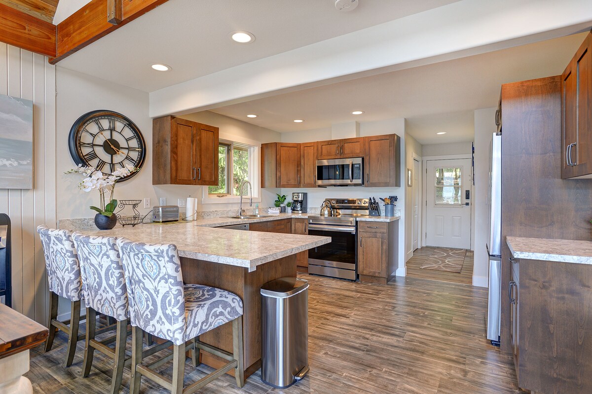 »Suita zgoraj« je vhod v pustolovščino, primeren za vse letne čase. Na zasebni terasi z žarom na zemeljski plin lahko uživate v razgledu na jezero Shuswap - nikoli vam ne bo zmanjkalo goriva! Kuhinja je v celoti opremljena s posodo, pripomočki, kozarci, skodelicami, aparatom za kavo, grelnikom vode in drugimi potrebščinami, ki vam bodo omogočile obrok na terasi ali za jedilno mizo v apartmaju. Apartma je klimatiziran, bivalni prostor pa ima udoben kamin na zemeljski plin za tiste hladnejše dni in noči.