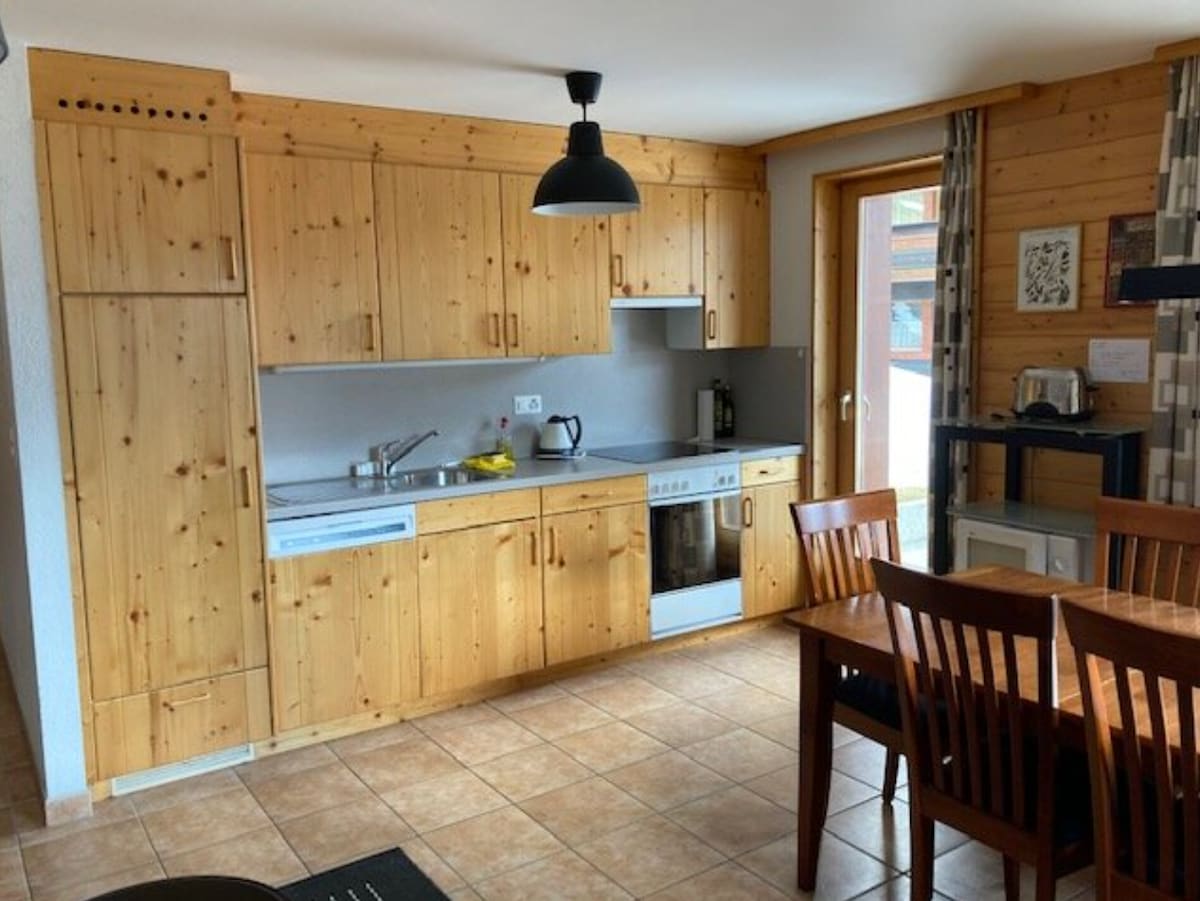 Ta nastanitev na odlični lokaciji ponuja enostaven dostop do vse opreme (gondola, pekarna, restavracija, restavracija, Coop, Village Market, restavracija, avtobusna postaja). Vse je < 100 m. Terasa s pogledom na dolino ni spregledana Velika dnevna jedilnica (raztegljiv kavč), popolnoma opremljena kuhinjska niša, spalnica (z 2 enojnima posteljama) in kopalnica. 1 zasebno parkirno mesto v sklopu podzemnega parkirišča stavbe Posteljnina in kopalna posteljnina narazen: 15 fr/osebo Kajenje v prenočišču ni dovoljeno