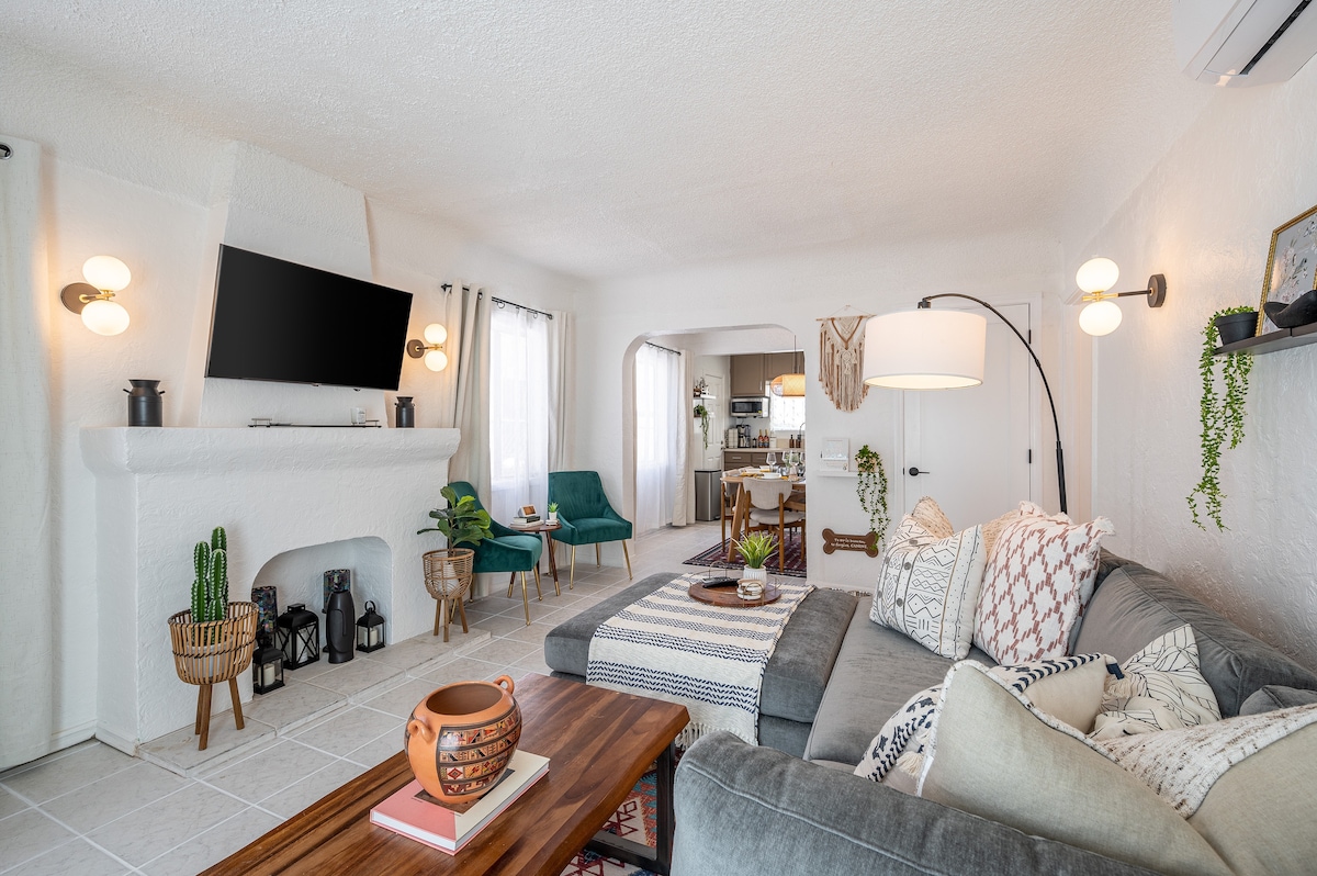 Dobrodošli v naši sodobni španski hišici za goste, ki se nahaja v očarljivi zgodovinski soseski California Heights. Uživajte v kavi z zasebne terase, namestite se v naši dnevni sobi iz sredine stoletja ali pa se sprostite v na novo prenovljenem spa centru, kot je kopalnica. Sprehodite se do ene od številnih restavracij ali kavarn, do katerih se lahko sprehodite. V naši svetli in svetli hiši za goste se boste počutili, kot da ste resnično »odsotni«, vendar z vso opremo in udobjem doma. Vključuje 1 parkirno mesto za limuzino.