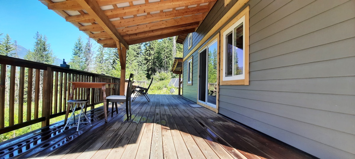 Pozabite na skrbi v tem mirnem prenočišču, ki je od 4 termalnih vrelcev oddaljeno pol ure. 5 minut hoje do spektakularne peščene plaže nasproti Saddle Mtn in 7 minut vožnje do Nakuspsa. Naša suita s površino 1100 kvadratnih metrov vključuje 2 zelo udobni zakonski postelji, razkošno kuhinjo in pralnico. Pokrita terasa z jedilnimi in počivališči ob pomirjujočem ribniku. Zasebno zatočišče za viseče mreže s pogledom na Baerg Creek. Pohod na sedlo Mnt. Sprehodite se po sprehajalni poti ob obali. Mtn bike Mt. Abriel. Nakusp, Halcyon, Halfway in St. Leon Hot Springs.