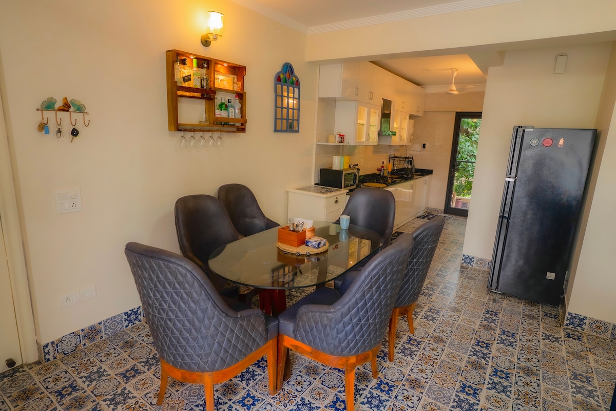 Dobrodošli v gradu White Feather, luksuznem stanovanju 2BHK, le nekaj minut od plaže Candolim v Severni Goi. Uživajte v osupljivem pogledu na bazen in reko z zasebnega balkona. Idealno za družine, pare in osebe, ki delajo na daljavo, z visokohitrostnim Wi-Fi-jem, klimatiziranim prenočiščem, popolnoma opremljeno kuhinjo, dnevnim čiščenjem, rezervnim napajanjem, zavarovanim parkiriščem z ograjo z bazenom in telovadnico ter opremo, primerno za otroke. Stopnice od živahnih restavracij, nočnega življenja in znanih plaž. Rezervirajte svoj spokojen in eleganten oddih v Goanu še danes.
