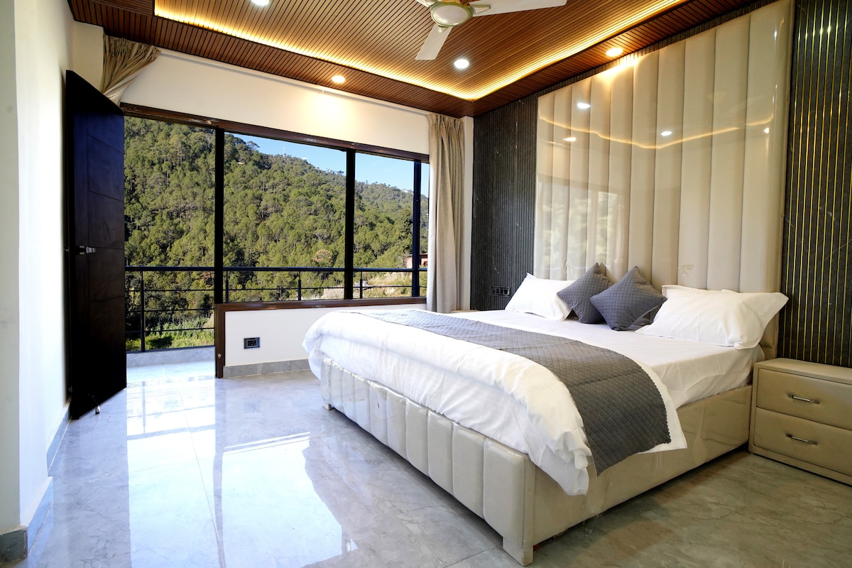 Set against the backdrop of Kasauli’s rolling hills, this elegant 3-BHK home offers a quiet escape surrounded by forested slopes and sweeping valley views. A spacious living room blends effortlessly with a chic dining area and a fully equipped modular kitchen, all styled with warm wooden flooring, plush furnishings, and tasteful modern accents. Each bedroom opens to a private wraparound balcony with forest and valley views, complete with a swing and sit-out for quiet, scenic moments.