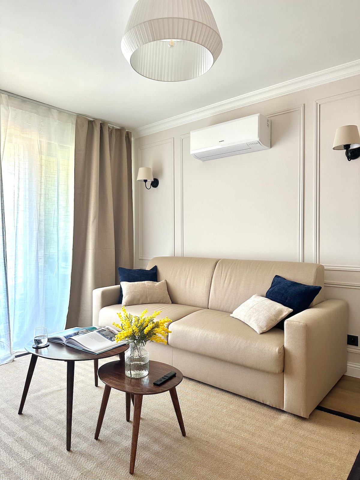 Joli appartement refait à neuf et climatisé, au 2ème étage (sans ascenseur) d'une résidence arborée avec piscine. Idéalement situé à Sanary-sur-Mer, entre la gare (12 min à pieds) et le port (15/20 min à pieds). Résidence sécurisée. Une place de parking est mise à votre disposition gratuitement. Vous pourrez venir y séjourner en amoureux, en famille, entre amis ou lors de vos déplacements professionnels. L'accès à l'autoroute se situe à seulement 2 min en voiture.