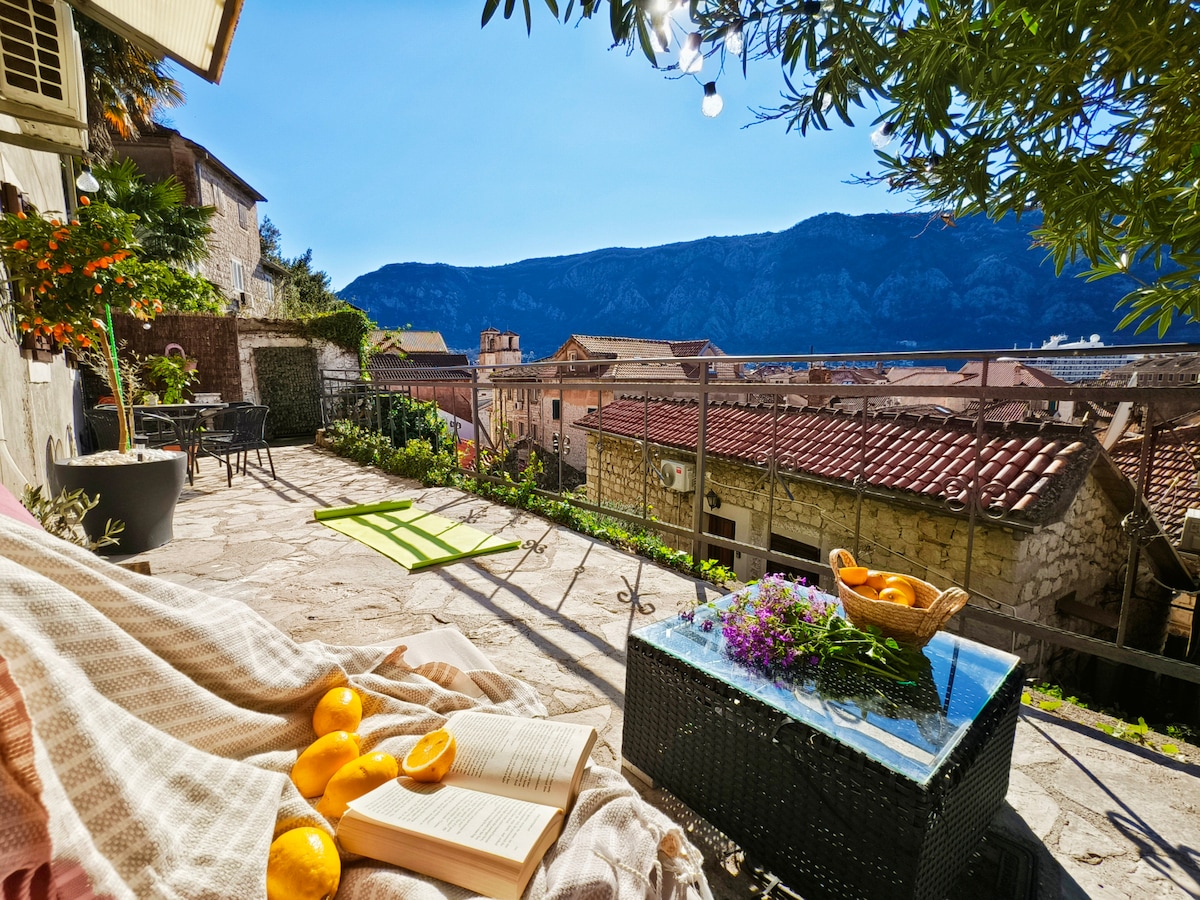 Svetlo in udobno, elegantno stanovanje s popolnoma opremljeno kuhinjo. Nahaja se v srednjeveški kamniti hiši v najbolj slikovitem delu starega mestnega jedra Kotorja. Bivališče ima čudovito zasebno teraso s pogledom na strehe starega mestnega jedra, Kotorski zaliv in gore. Ločena spalnica, dnevna soba, popolnoma opremljena kuhinja, Wi-Fi in klimatska naprava vam bodo omogočili, da med bivanjem v zgodovinski hiši uživate v sodobnem udobju. Zelo osrednje in živahno, le nekaj minut hoje od avtobusne postaje in plaž.