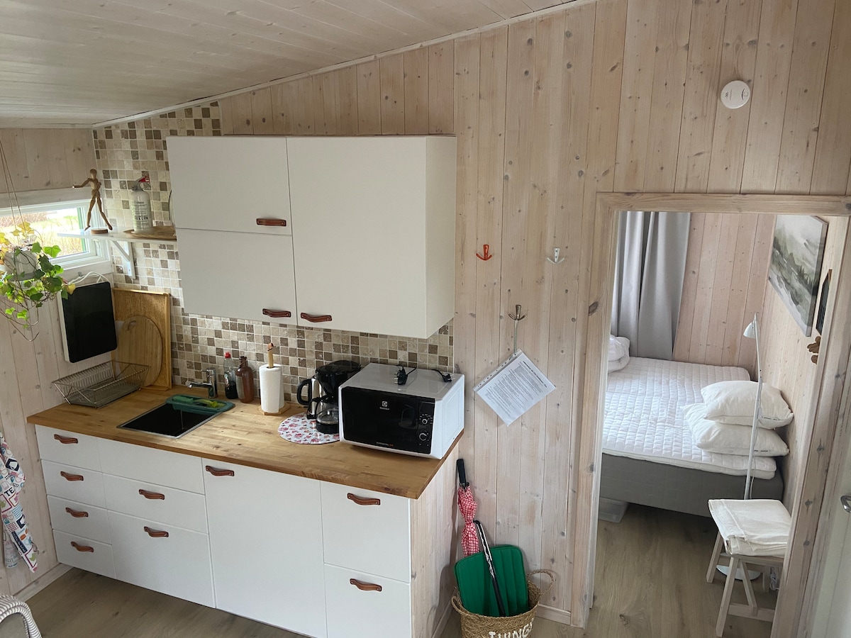 Sprostite se v tem edinstvenem in mirnem prostoru. Le 10 minut vožnje od središča mesta. Hiša je velika približno 65 m2 in na novo zgrajena, vendar v pristnem podeželskem slogu. Tukaj boste našli popolnoma opremljeno kuhinjo z večino stvari, ki jih potrebujete. Majhna, vendar pametna kopalnica s straniščem in prho. Pralnica s sušilnim strojem. Prostorna dvoposteljna soba in zakonska postelja v TV sobi. Tukaj živite z gozdom tik za vogalom in dvema naravnima rezervatama z več pohodniškimi potmi in ptičjimi jezeri v bližini. Enodnevne nočitve na zahtevo poleti.