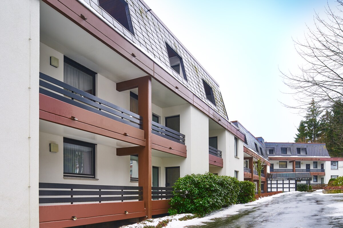 Welcome to this beautiful 70m² apartment in close proximity to the famous ski area in Winterberg. The accommodation is fully equipped and designed to be your home away from home in Winterberg! → Sauna and pool → Fully equipped kitchen → 1 king-size box-spring bed | 1 queen-size bed | 1 single bed → 50 & 55 inch smart TV → Modern bathroom → Directly on the golf course! → Balcony “The accommodation is highly recommended Everything was clean and the pool / sauna were great!”