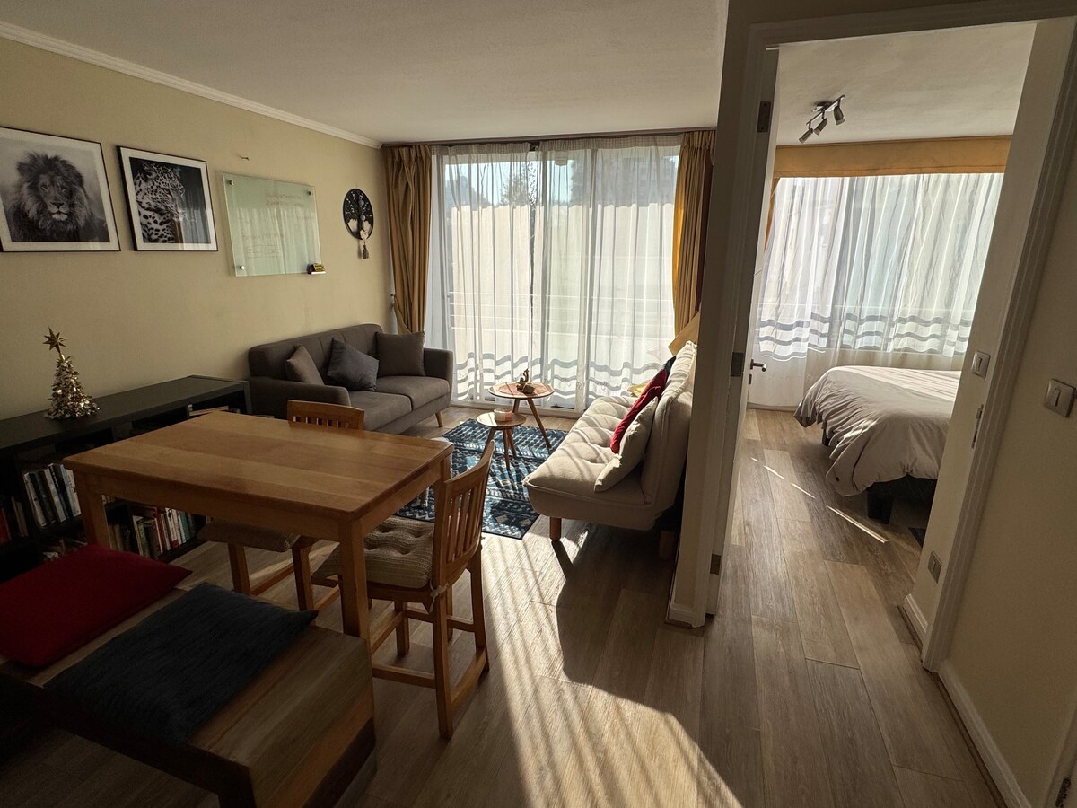 Unobstructed view 100% ✅ Prime loc. 16th floor, northeast mountain views 🏔 Modern 55 m² apartment, bright. Unique with iconic design furniture 🌎 50” Smart TV, FREE WiFi. Full bathroom with shower and fully equipped kitchen. Only 10 meters from Los Leones Metro 🚇 restaurants, supermarkets, banks, pharmacies, and more. 5 min walk to Costanera Center. 24/7 security building. 💡 Perfect for business travelers, couples, or tourists who want the best location comfort, style, and an amazing view.