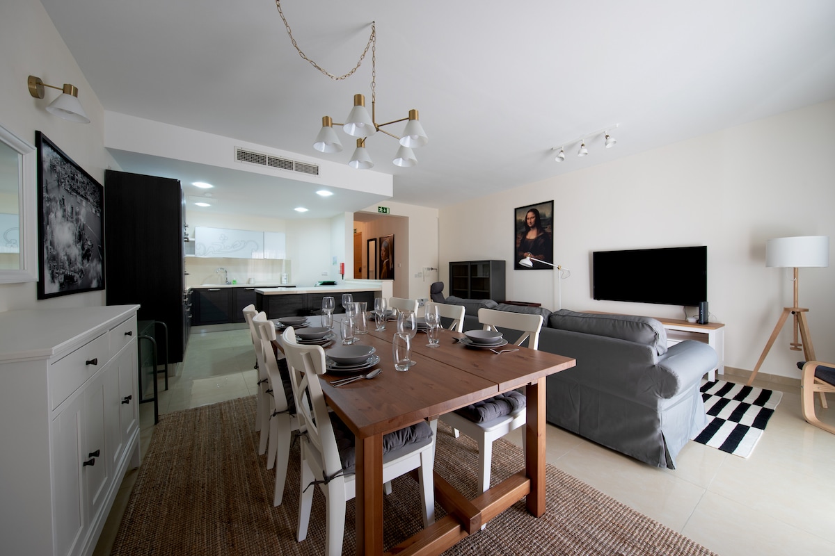 Dobrodošli v svojem ekskluzivnem prenočišču, sodobnem prostoru s površino 250 m2 z veliko teraso in zasebno masažno kadjo, ki ponuja osupljiv razgled na morje in Valletto. Tik ob trajektu Sliema in v bližini trendovskih restavracij je vse, kar potrebujete, na vašem pragu. Uživajte v bivanju odprtega tipa, elegantni dekoraciji in dovolj prostora za sprostitev. Upoštevajte, da lahko zaradi bližnjih gradbenih del pride do občasnega dnevnega hrupa, saj Malta vedno raste.