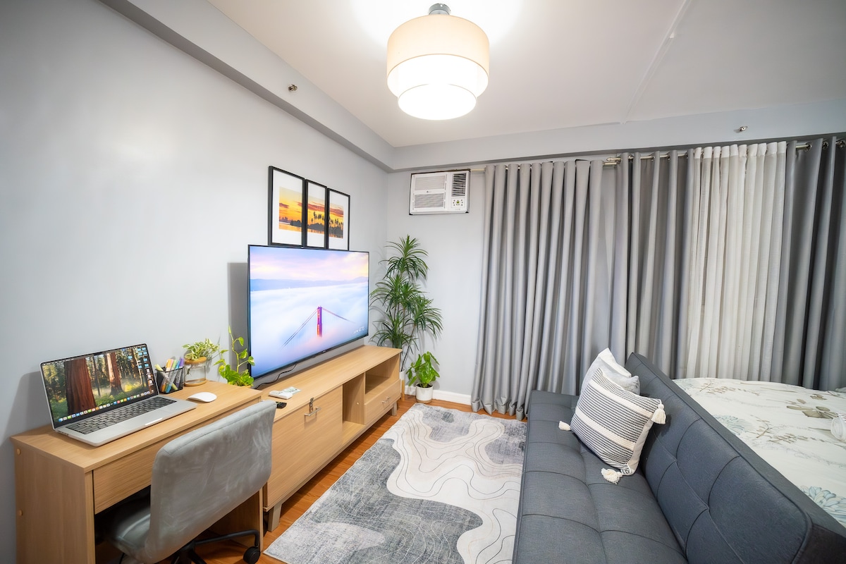 Hotelski studio z balkonom, ki gleda na bazen in otroško igrišče. Za kongresnim centrom SM Lanang/SMX, poleg stavbe Iqor in Whisky Parka (največji azijski park z alkoholnimi pijačami), Acacia Hotel, Grand Regal, Azuela Cove, Dusit Thani, Waterfront Insular, letališče Davao, Abreeza Mall, SPMC. Uživajte v hitrem internetu s hitrostjo 600 Mb/s, ki je kot nalašč za delo na daljavo ali pretakanje. Popolno za poslovna potovanja, zdravstvene namene, pare, družine in počitnice – udobje, slog in priročnost na vrhunski lokaciji.