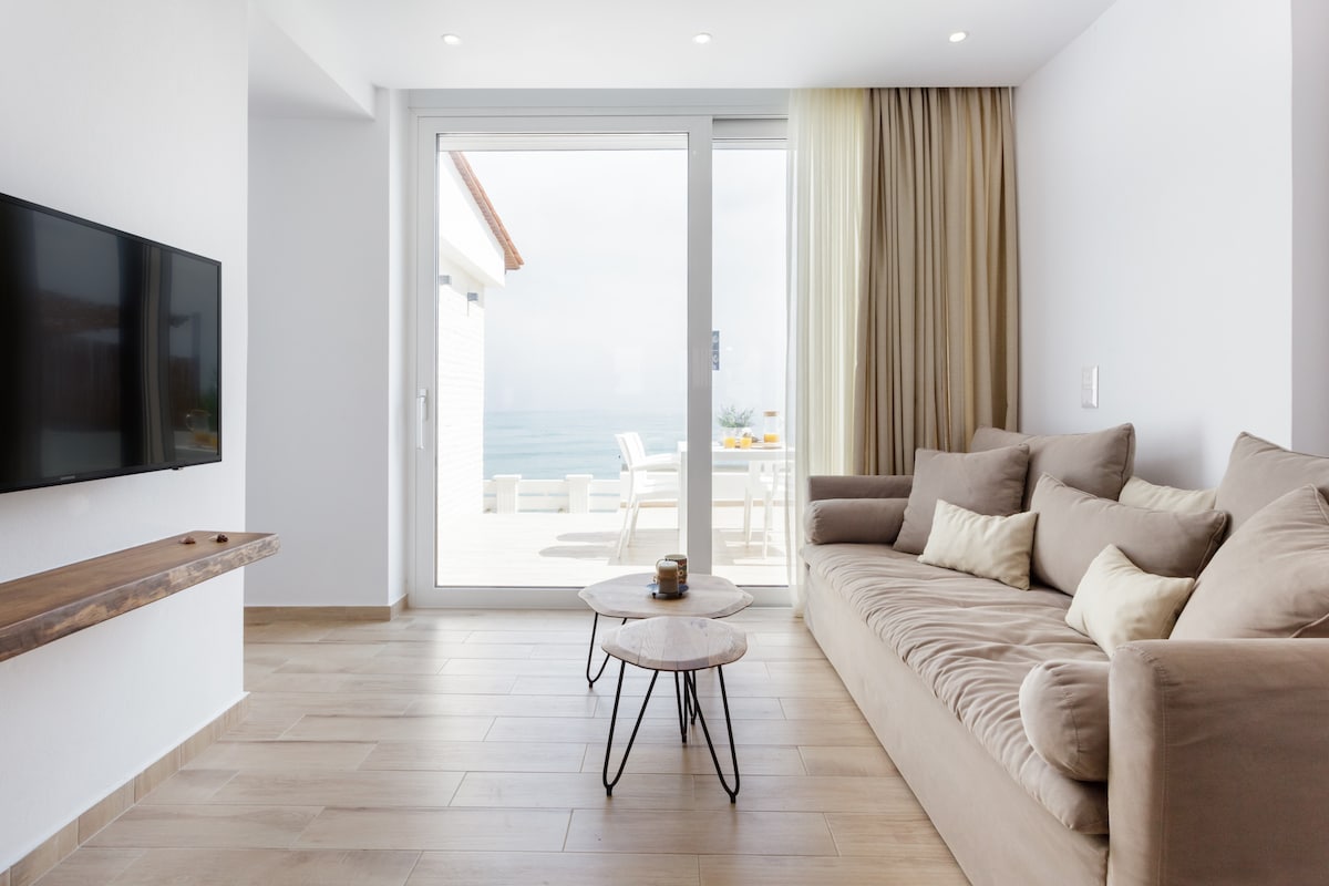 Escape to Seafront Suites, a private hideaway beside a celestial blue sea on Hersonissos stunning Beach Rivera. Nestled on a tranquil and secluded bay with panoramic views and sunsets that dazzle, the rest of the world does not exist, giving you freedom to release your inhibitions and live for the moment. More information Our luxury Suite with garden view is modern and minimalist with extremely comfortable guest rooms, earth tones and modern touches to soothe the mind and warm the soul.