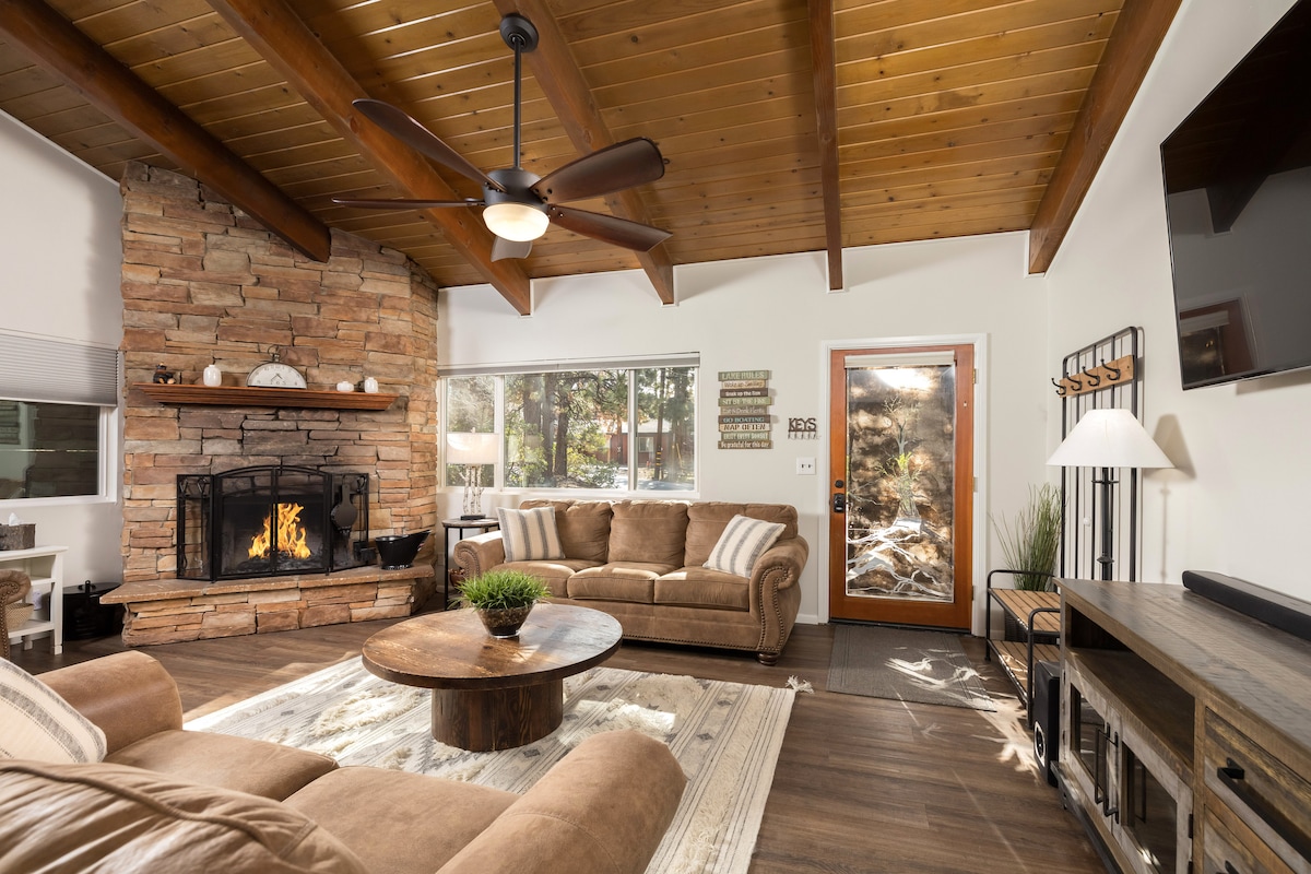 ODLIČNA LOKACIJA! SPREHODITE se do SNEŽNEGA VRHA za smučanje, deskanje, kolesarjenje in pohodništvo! Prav tako ste le nekaj minut stran od trgovin in restavracij Village, jezera Big Bear Lake in še veliko več! Uživajte v CENTRALNI KLIMATSKI NAPRAVI in OGREVANJU ter visokohitrostnem brezžičnem internetu v našem udobnem enonadstropnem bivalnem prostoru z odprtim konceptom. Sedite ob prasketajočem ognju, igrajte igre, gledajte svoj najljubši film ali opazujte zvezde, medtem ko se sproščate v masažni kadi. Naša koča je odlična za prijatelje in družine - tako otroci kot psi so dobrodošli!