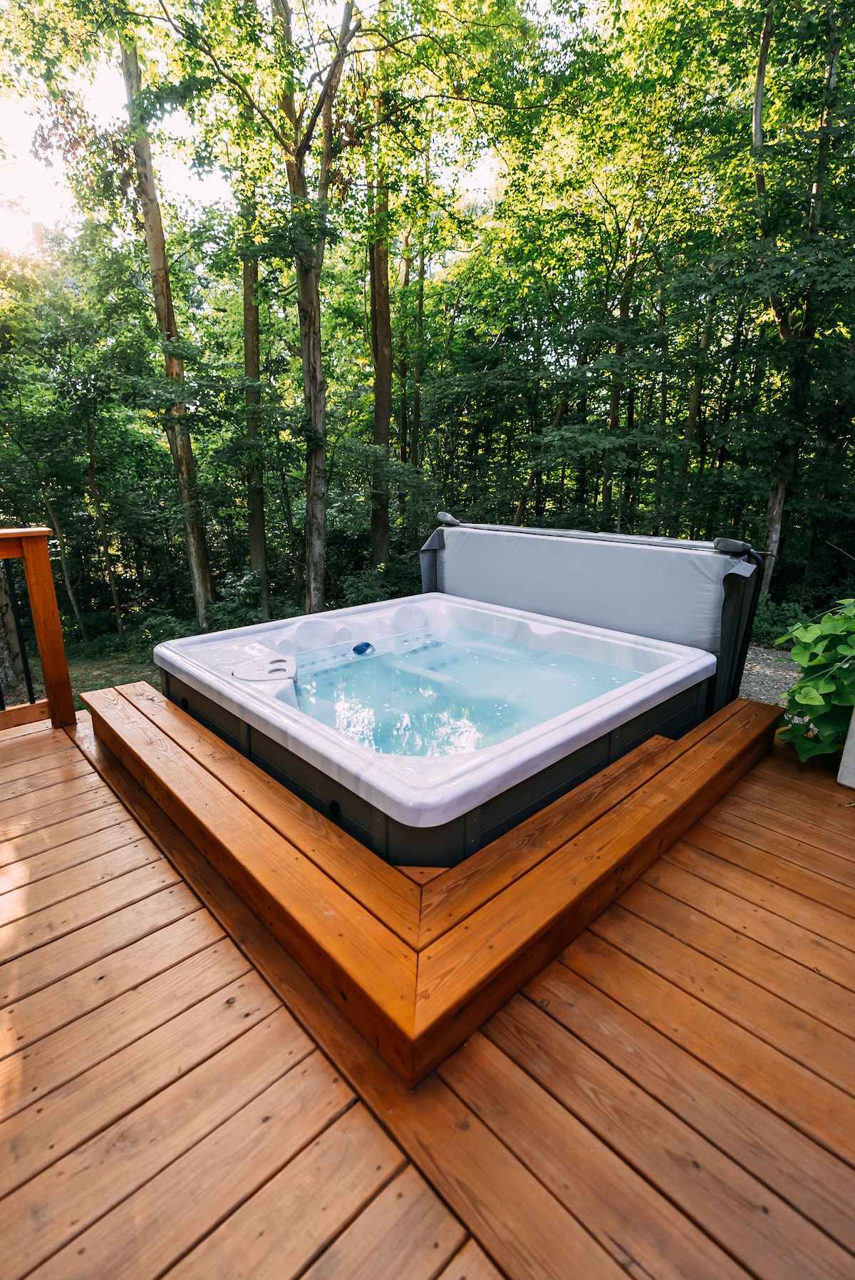 We look forward to welcoming you to the secluded beauty of our space, designed and built by my husband on our 20 acres of wooded property in the rolling hills of Central Ohio. A floor-to-ceiling glass front provides you with a view of fields green in summertime and ripe with goldenrod in the fall, four outdoor deck spaces invite you to relax in the beauty of nature, and a second story loft suite with a soaking tub are ready to provide you with rest and refreshment.