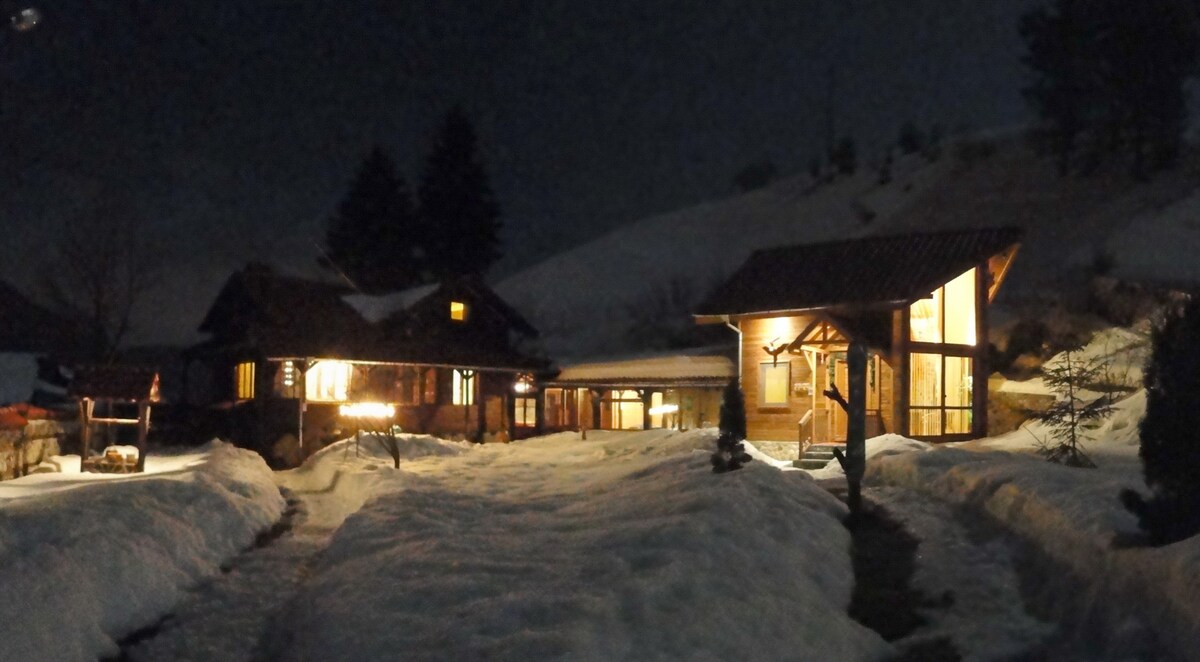 Naš elegantni 4-sobni planinski dom, ki se nahaja sredi borovih gozdov s pogledom na gore, ponuja redko razkošno doživetje. V koči lahko spi 8 oseb, saj ima 2 spalnici z zakonskima posteljama in 2 sobi z eno pogradjo. V zgornjem nadstropju je odprta kuhinja/jedilnica, dnevna soba z barom, ki ponuja dih jemajoče sončne zahode za sprostitev. Dva balkona. Ostanite povezani z brezplačnim Wi-Fi-jem, udobno se namestite ob ognju z brezplačnimi drvi in udobno parkirajte svoje vozilo v sklopu prenočišča. Rezervirajte zdaj za nepozaben gorski in smučarski oddih.