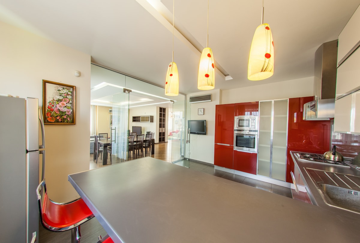 luksuzna 2 apartmaja v osrčju prestolnice. oba sta v istem 5. nadstropju 6-nadstropne stavbe z dvigalom. Elegantno italijansko pohištvo, čudovit dizajn, udobje in udobnost vam bodo prinesli užitek bivanja v tem apartmaju. Vsak apartma s 3 ločenimi spalnicami (skupaj - 6 spalnic), prostornimi dnevnimi sobami in kuhinjami, 3 kopalnicami, dvema straniščema ] Apartmaji so popolnoma opremljeni z vsemi aparati, kuhinjo in kopalnico. Internet WI-FI. Spi 12 (2+2+2+2+2+2).