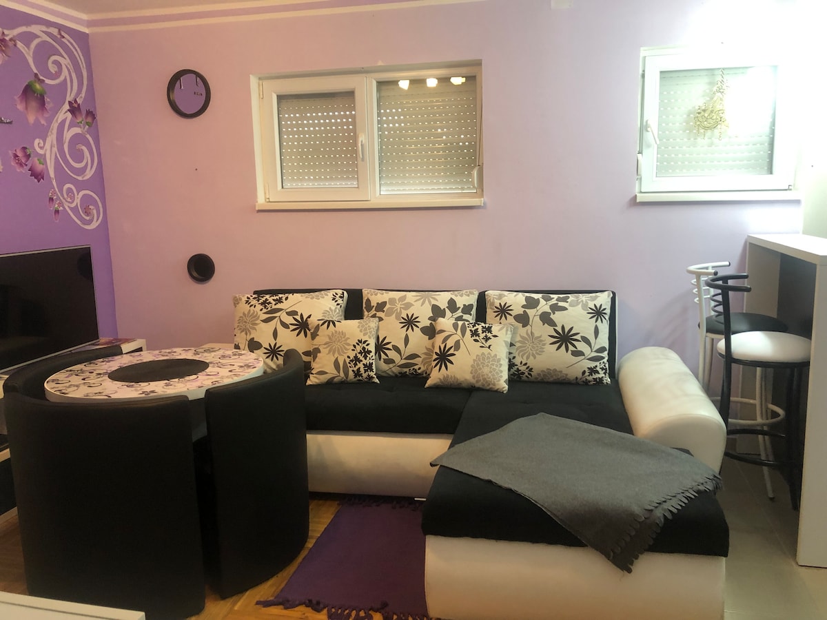 Apartma se nahaja v centru Somborja v neposredni bližini glavne ulice. To je dvosobno stanovanje s skupno površino 59m2. Imeli boste dostop do celotnega apartmaja, vključno z udobno dnevno sobo z mizo za učenje, spalnico z zakonsko posteljo, popolnoma opremljeno kuhinjo in jedilnico, kopalnico s tušem, WiFi, TV in balkonom. Brezplačno parkirišče je na voljo, dostop do zasebne garaže pa se lahko uredi tudi na zahtevo.