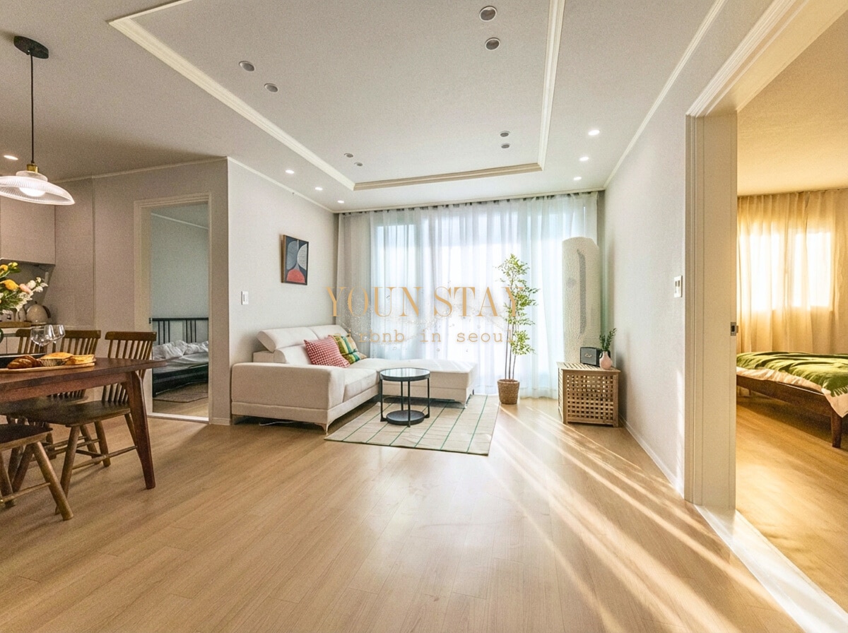 Dobrodošli v Cocone z naravo v mestu. Odprli smo 2. vejo Coconea, ker veliko ljudi obožuje in ceni 1. vejo. ^^ Celoten notranji koncept je podoben 1. veji, vendar ima Coco Ne 2nd podružnica očarljivo strukturo z 2 sobama, zato je primerna za potovanje sami ali za 2 do 6 oseb. Druga podružnica je tudi prostor, ki smo ga skrbno uredili, zato upam, da se boste lahko sprostili in uživali v njem. ^^ * Podružnica Coco Ne 1st ima 3 sobe in lahko sprejme do 8 oseb. Poleg tega smo skrbno pripravili vrhunske stropne vzmetnice in posteljnino iz hotelov s 5 zvezdicami, v upanju, da bomo ustvarili veliko prijetnih in posebnih spominov v najboljšem stanju. Poleg tega lahko udobno uživate v YouTubu in Netflixu s 65-palčnim televizorjem. Upam, da se boste lahko sprehodili po čudovitem olimpijskem parku in jezeru Seokchon v središču mesta, kjer lahko občutite spremembe štirih letnih časov in izkusite čas zdravljenja z naravo ^^