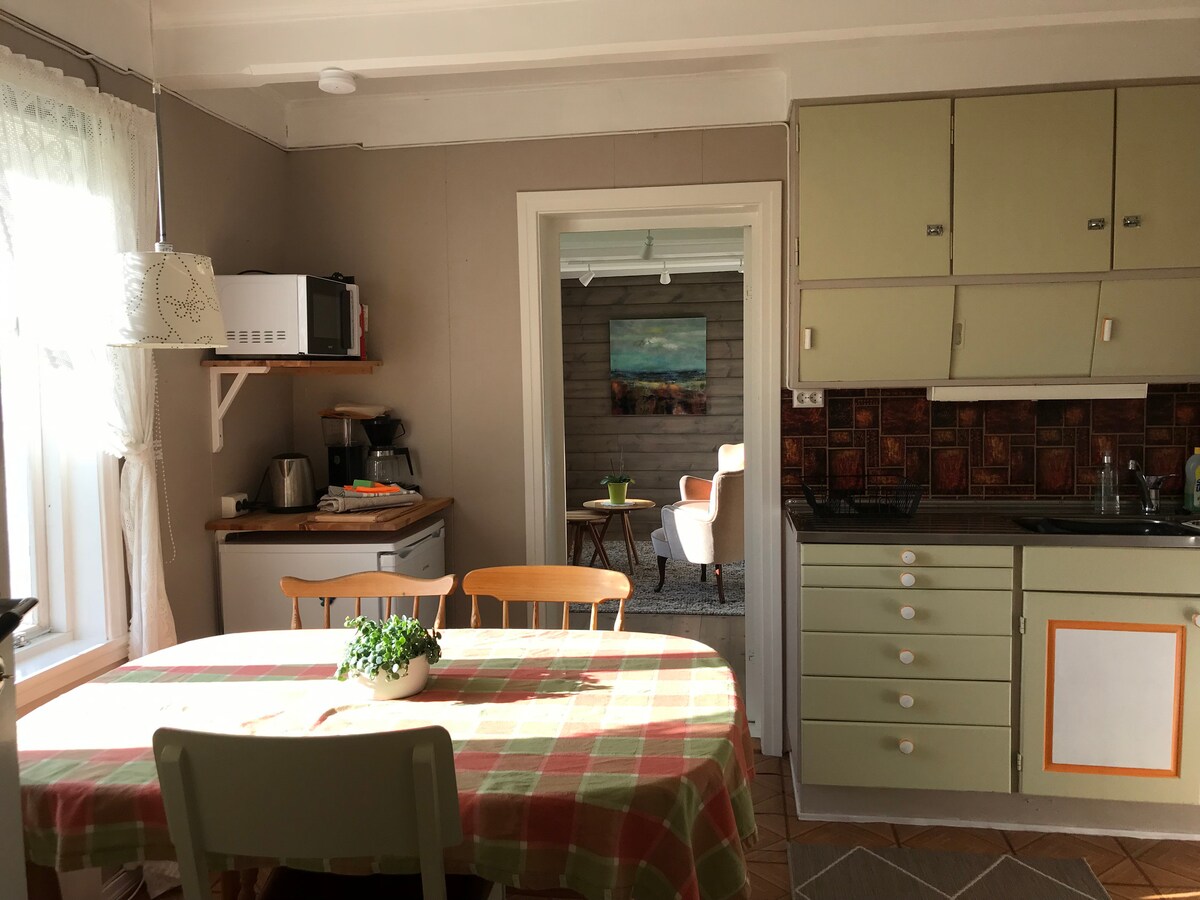 Stanovanje obsega celotno pritličje majhne kmečke hiše in ima glavno spalnico z lastno kopalnico, dnevno sobo (deluje kot druga spalnica, ko je več kot dva gosta), kuhinjo in drugo kopalnico. Okolica je mirna in parkirate lahko tik pred vrati. V določenih letnih časih lahko vidite jelene ali žerjave. Poleti se krave pasejo na bližnjih poljih; tradicionalni skedenj je zdaj kulturno središče, ki ga vodi Fjøsakademiet.