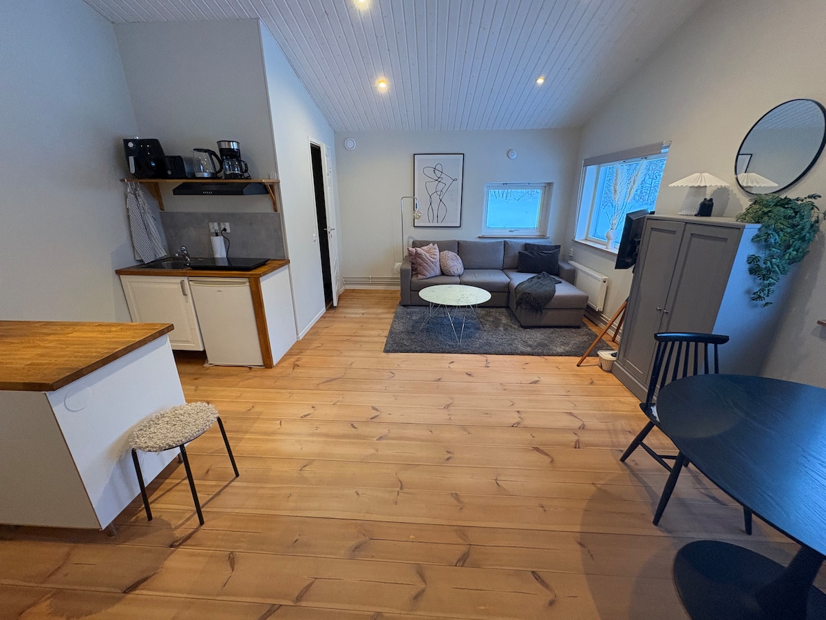 Soba s kuhinjsko nišo, 25 kvadratnih metrov. Kopalnica s prho. Zakonska postelja (širine 120 cm) in raztegljiv kavč za 2 osebi. Nastanitev je primerna za 2 odrasli osebi, vendar je na voljo tudi prostor za 2 majhna otroka. Kuhinja je opremljena s štedilnikom, hladilnikom, mikrovalovno pečico, grelnikom za vodo in aparatom za kavo. TV in Wi-Fi. Brisače in posteljnina so vključene. Na voljo je tudi pralnica, ki se nahaja v glavni stavbi. Za posteljnino in podobno zaračunamo strošek čiščenja v višini 200 SEK. Vendar pa pričakujemo, da boste pred odhodom opravili temeljito čiščenje.