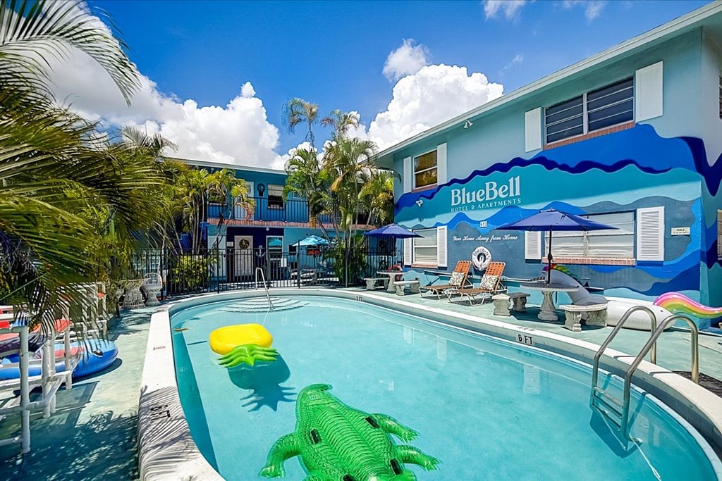 Welcome to The Bell, your tropical retreat with retro-chic twist in Fort Lauderdale! Perfect for groups or families, our fully furnished apartments offer a unique blend of south Florida charm and eclectic style. Just minutes from Port Everglades, the airport, and Las Olas, our location is unbeatable. Dive into our pristine pool, enjoy our lush gardens, and embrace the South Florida sunshine. Step out and explore, then unwind in a space that's as vibrant and welcoming as the city itself.